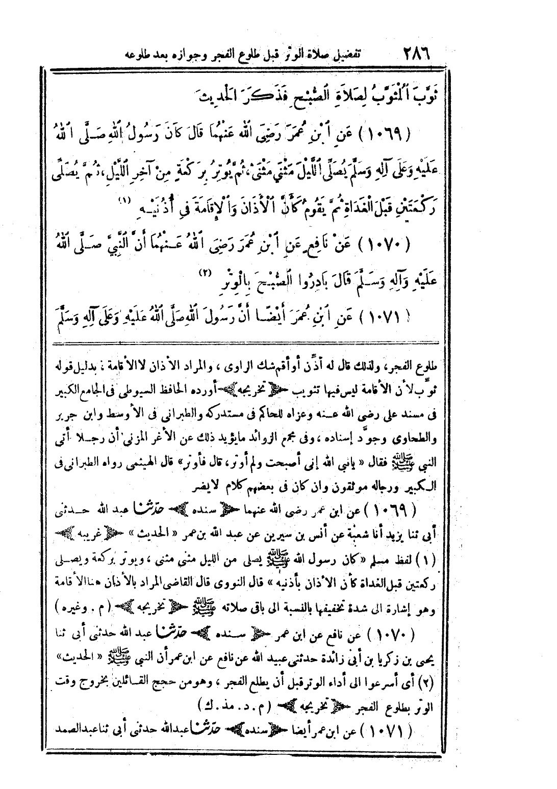 (1070) عن نافع عن ابن عمر رضي الله عنهما أن النبي صلى الله عليه وعلى آله وسلم قال بادروا الصبح بالوتر (2).