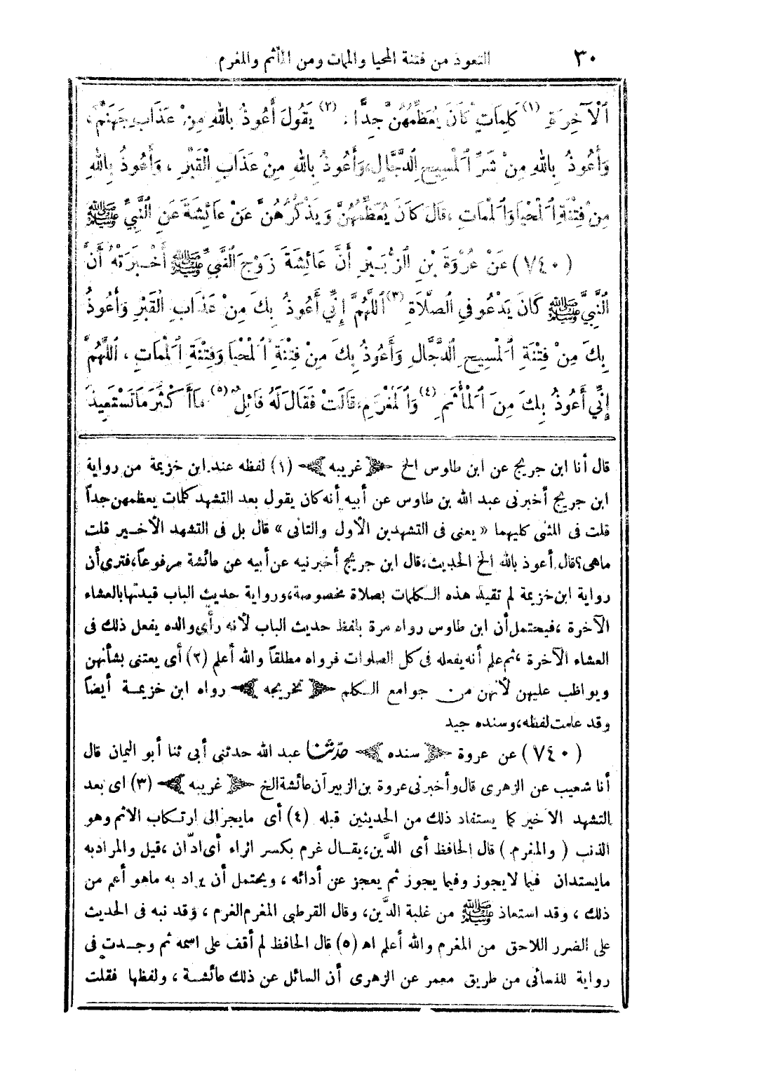 قال أنا ابن جريج عن ابن طاوس الخ. (غريبه) 1 - لفظه عند ابن خزيمة من رواية ابن جريج أخبرني عبد الله بن طاوس عن أبيه أنه كان يقول بعد التشهد كلمات يعظمهن جدًا. قلت: في المثنى كليهما؟ (يعني في التشهدين الأول والثاني) قال: بل في التشهد الأخير. قلت: ما هي؟ قال: أعوذ بالله الخ الحديث. قال ابن جريج: أخبرنيه عن أبيه عن عائشة مرفوعًا، فترى أن رواية ابن خزيمة لم تقيد هذه الكلمات بصلاة مخصوصة، ورواية حديث الباب قيدتها بالعشاء الآخرة، فيحتمل أن ابن طاوس رواه مرة بلفظ حديث الباب لأنه رأى والده يفعل ذلك في العشاء الآخرة، ثم علم أنه يفعله في كل الصلوات فرواه مطلقًا, والله أعلم. 2 - أي يعتني بشأنهن ويواظب عليهن لأنهن من جوامع الكلم. (تخريجه) رواه ابن خزيمة أيضًا وقد علمت لفظه، وسنده جيد. 740 - عن عروة (سنده) حدثنا عبد الله حدثني أبي ثنا أبو اليمان قال أنا شعيب عن الزهري قال: وأخبرني عروة بن الزبير أن عائشة الخ. (غريبه) 3 - أي بعد التشهد الأخير كما يستفاد ذلك من الحديثين قبله. 4 - أي ما يجر إلى ارتكاب الإثم وهو الذنب. و «المغرم» قال الحافظ: أي الدين. يقال غرم بكسر الراء أي ادّان، قيل: والمراد به ما يستدان فيما لا يجوز وفيما يجوز ثم يعجز عن أدائه، ويحتمل أن يراد به ما هو أعم من ذلك، وقد استعاذ صلى الله عليه وسلم من غلبة الدين، وقال القرطبي: المغرم الغرم، وقد نبه في الحديث على الضرر اللاحق من المغرم، والله أعلم. اهـ. 5 - قال الحافظ: لم أقف على اسمه، ثم وجدت في رواية للنسائي من طريق معمر عن الزهري أن السائل عن ذلك عائشة، ولفظها «فقلت