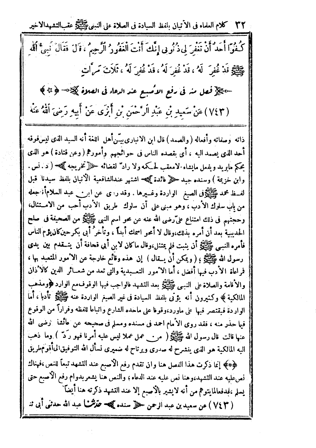 ذاته وصفاته وأفعاله. و «الصمد» قال ابن الأنباري: بين أهل اللغة أنه السيد الذي ليس فوقه أحد، الذي يصمد إليه، أي يقصده الناس في حوائجهم وأمورهم. وعن قتادة: هو الذي يحكم ما يريد ويفعل ما يشاء لا معقب لحكمه ولا راد لقضائه. (تخريجه) (د. نس. وابن خزيمة) وسنده جيد. (فائدة) اشتهر عند الشافعية الإتيان بلفظ «سيدنا» قبل لفظ «محمد» صلى الله عليه وسلم في الصيغ الواردة وغيرها. وقد روي عن ابن عبد السلام أنه جعله من باب سلوك الأدب، وهو مبني على أن سلوك طريق الأدب أحب من الامتثال، وحجتهم في ذلك امتناع عليّ رضي الله عنه عن محو اسم النبي صلى الله عليه وسلم من الصحيفة في صلح الحديبية بعد أن أمره بذلك، وقال: لا أمحو اسمك أبدًا. وتأخر أبي بكر حين كان يؤم الناس فأمره النبي صلى الله عليه وسلم أن يثبت فلم يمتثل، وقال: ما كان لابن أبي قحافة أن يتقدم بين يدي رسول الله صلى الله عليه وسلم. ويمكن أن يقال: إن هذه وقائع خارجة عن الأمور المتعبد بها، فمراعاة الأدب فيها أفضل، أما الأمور التعبدية والتي تعد من شعائر الدين كالأذان والإقامة والصلاة على النبي صلى الله عليه وسلم بعد التشهد فالواجب فيها الوقوف مع الوارد. ومذهب المالكية وكثيرون أنه يؤتى بلفظ السيادة في غير الصيغ الواردة عنه صلى الله عليه وسلم تأدبًا، أما الواردة فيقتصر فيها على ما ورد، وقوفًا على ما حده الشارع واتباعًا للفظه وفرارًا من الوقوع فيما حذر منه، فقد روى الإمام أحمد في مسنده ومسلم في صحيحه عن عائشة رضي الله عنها قالت: قال رسول الله صلى الله عليه وسلم: «من عمل عملاً ليس عليه أمرنا فهو رد»، وما ذهب إليه المالكية هو الذي ينشرح له صدري ويرتاح له ضميري، نسأل الله التوفيق إلى أقوم طريق. (*) - إنما ذكرت هذا الفصل هنا وإن تقدم رفع الأصبع عند التشهد تبعًا للنص، فهناك نص عليه عند التشهد، وهنا نص عليه عند الدعاء، والنص هنا يشعر بدوام رفع الأصبع حتى يسلم، فدفعًا لما يتوهم من أنه لا يشير بالأصبع إلا عند التشهد ذكرته هنا أيضًا. 743 - عن سعيد بن عبد الرحمن (سنده) حدثنا عبد الله حدثني أبي ثنا