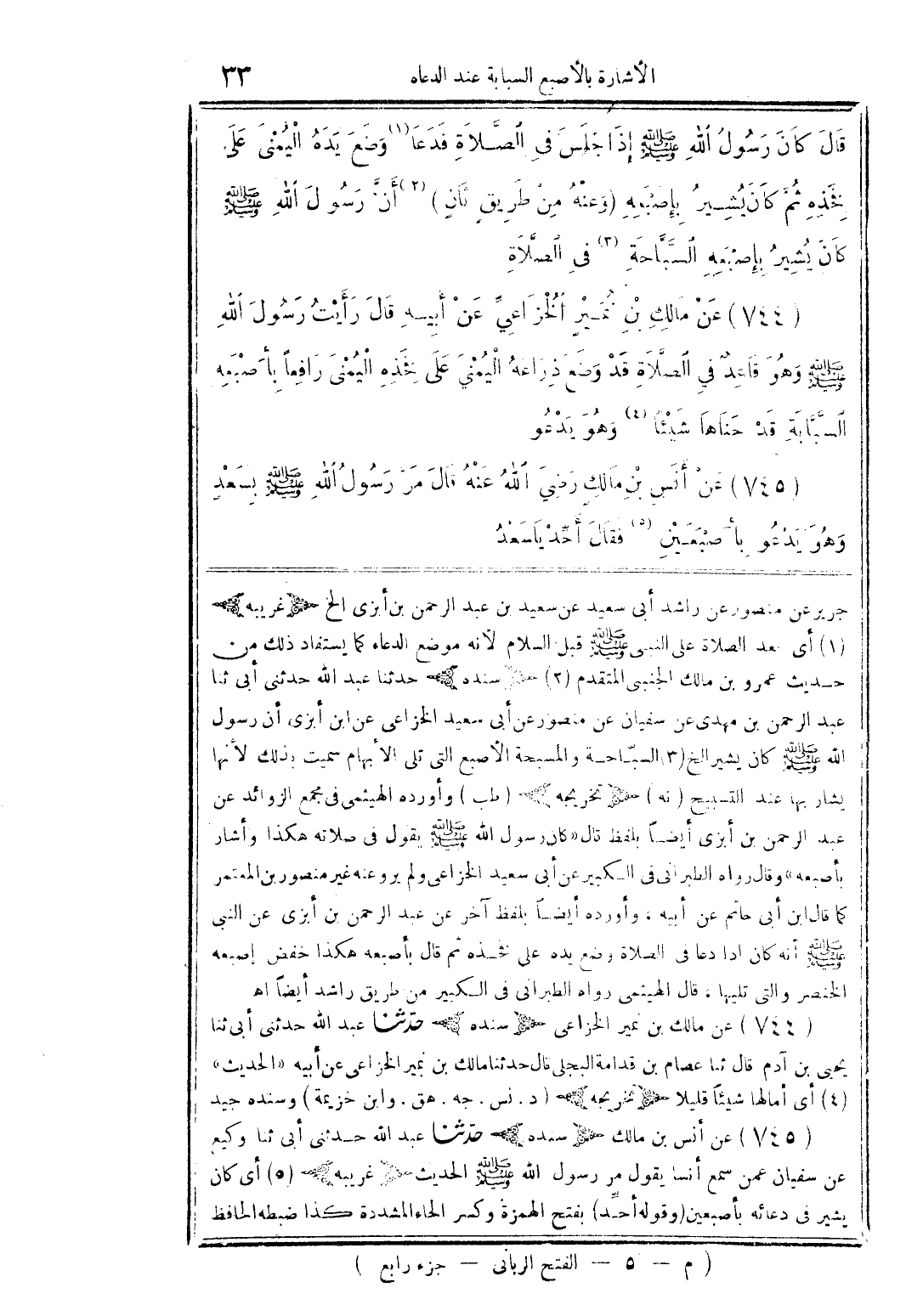جرير عن منصور عن راشد أبي سعيد عن سعيد بن عبد الرحمن بن أبزى الخ. (غريبه) 1 - أي بعد الصلاة على النبي صلى الله عليه وسلم قبل السلام لأنه موضع الدعاء كما يستفاد ذلك من حديث عمرو بن مالك الجنبي المتقدم. (سنده) 2 - حدثنا عبد حدثني أبي ثنا عبد الرحمن بن مهدي عن سفيان عن منصور عن أبي سعيد الخزاعي عن ابن أبزى أن رسول الله صلى الله عليه وسلم كان يشير الخ. 3 - السباحة والمسبحة الأصبع التي تلي الإبهام، سميت بذلك لأنها يشار بها عند التسبيح. (له). (تخريجه) (طب) وأورده الهيثمي في مجمع الزوائد عن عبد الرحمن بن أبزى أيضًا بلفظ قال: «كان رسول الله صلى الله عليه وسلم يقول في صلاته هكذا وأشار بأصبعه». وقال رواه الطبراني في (الكبير) عن أبي سعيد الخزاعي ولم يرو عنه غير منصور بن المعتمر كما قال ابن أبي حاتم عن أبيه، وأورده أيضًا بلفظ آخر عن عبد الرحمن بن أبزى عن النبي صلى الله عليه وسلم أنه كان إذا دعا في الصلاة وضع يده على فخذه ثم قال بأصبعه هكذا خفض إصبعه الخنصر والتي تليها. قال الهيثمي: رواه الطبراني في (الكبير) من طريق راشد أيضًا. اهـ. 744 - عن مالك بن نمير الخزاعي (سنده) حدثنا عبد الله حدثني أبي ثنا يحيى بن آدم قال ثنا عصام بن قدامة البجلي قال حدثنا مالك بن نمير الخزاعي عن أبيه (الحديث) 4 - أي أمالها شيئًا قليلاً. (تخريجه) (د. نس. جه. هق. وابن خزيمة) وسنده جيد. 745 - عن أنس بن مالك (سنده) حدثنا عبد الله حدثني أبي ثنا وكيع عن سفيان عمن سمع أنسًا يقول: مر رسول الله صلى الله عليه وسلم (الحديث). (غريبه) 5 - أي كان يشير في دعائه بأصبعين. وقوله «أحِّد» بفتح الهمزة وكسر الحاء المشددة، كذا ضبطه الحافظ