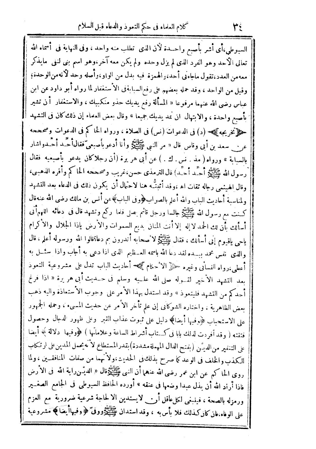 السيوطي، أي أشر بأصبع واحدة، لأن الذي تطلب منه واحد، وفي (النهاية) في أسماء الله تعالى «الأحد» وهو الفرد الذي لم يزل وحده ولم يكن معه آخر، وهو اسم بني لنفي ما يذكر معه من العدد، تقول: ما جاءني أحد، والهمزة فيه بدل من الواو، وأصله وحد لأنه من الوحدة، وقيل من الواحد، وقد حمله بعضهم على رفع السبابة في الاستغفار لما رواه أبو داود عن ابن عباس رضي الله عنهما مرفوعًا «المسألة رفع يديك حذو منكبيك، والاستغفار أن تشير بأصبع واحدة، والابتهال أن تمد يديك جميعًا» وقال بعض العلماء: إن ذلك كان في التشهد. (تخريجه) (د) في الدعوات. (نس) في الصلاة. ورواه الحاكم في الدعوات وصححه عن سعد بن أبي وقاص، قال: «مر النبي صلى الله عليه وسلم وأنا أدعو بأصبعيّ فقال: أحِّد أحِّد وأشار بالسبابة» ورواه (مذ. نس. ك.) عن أبي هريرة «أن رجلاً كان يدعو بأصبعيه فقال رسول الله صلى الله عليه وسلم أحِّد أحِّد» قال الترمذي: حسن غريب. وصححه الحاكم وأقره الذهبي. وقال الهيثمي: رجاله ثقات. اهـ. وقد أثبته هنا لاحتمال أن يكون ذلك في الدعاء بعد التشهد ولمناسبة أحاديث الباب والله أعلم بالصواب. وفي الباب عن أنس بن مالك رضي الله عنه قال: كنت مع رسول الله صلى الله عليه وسلم جالسًا ورجل قائم يصلي فلما ركع وتشهد قال في دعائه اللهم إني أسألك بأن لك الحمد لا إله إلا أنت المنان بديع السموات والأرض يا ذا الجلال والإكرام يا حي يا قيوم إني أسألك، فقال صلى الله عليه وسلم لأصحابه: أتدرون بم دعا؟ قالوا: الله ورسوله أعلم. قال: والذي نفس محمد بيده لقد دعا الله باسمه العظيم الذي إذا دعي به أجاب وإذا سئل به أعطى. رواه النسائي وغيره. (الأحكام) أحاديث الباب تدل على مشروعية التعوذ بعد التشهد الأخير لقوله صلى الله عليه وسلم في حديث أبي هريرة «إذا فرغ أحدكم من التشهد فليتعوذ» وقد استدل بهذا الأمر على وجوب الاستعاذة وإليه ذهب بعض الظاهرية، واختاره الشوكاني إن علم تأخر الأمر عن حديث المسيء. وحمله الجمهور على الاستحباب. وفيها أيضًا دليل على ثبوت عذاب القبر وعلى ظهور الدجال وحصول فتنته (وقد أفردت لذلك بابًا في كتاب أشراط الساعة وعلاماتها).
