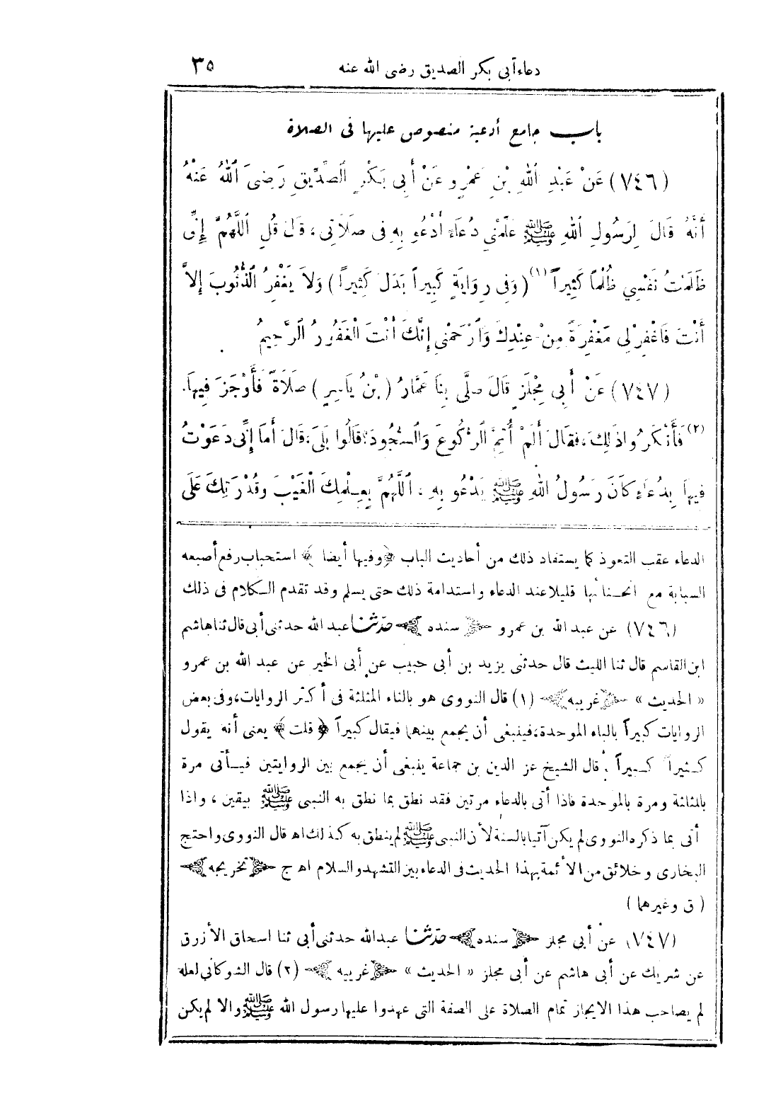 الدعاء عقب التعوذ كما يستفاد ذلك من أحاديث الباب. وفيها أيضًا استحباب رفع أصبعه السبابة مع انحنائها قليلاً عند الدعاء واستدامة ذلك حتى يسلم وقد تقدم الكلام في ذلك. 746 - عن عبد الله بن عمرو (سنده) حدثنا عبد الله حدثني أبي قال ثنا هاشم بن القاسم قال ثنا الليث قال حدثني يزيد بن أبي حبيب عن أبي الخير عن عبد الله بن عمرو (الحديث). (غريبه) 1 - قال النووي: هو بالثاء المثلثة في أكثر الروايات، وفي بعض الروايات «كبيرًا» بالباب الموحدة، فينبغي أن يجمع بينهما فيقال: «كبيرًا». قلت: يعني أنه يقول «كثيرًا كبيرًا». قال الشيخ عز الدين بن جماعة: ينبغي أن يجمع بين الروايتين فيأتي مرة بالمثلثة ومرة بالموحدة، فإذا أتى بالدعاء مرتين فقد نطق بما نطق به النبي صلى الله عليه وسلم بيقين، وإذا أتى بما ذكره النووي لم يكن آتيًا بالسنة لأن النبي صلى الله عليه وسلم لم ينطلق به كذلك. اهـ. قال النووي: واحتج البخاري وخلائق من الأئمة بهذا الحديث في الدعاء بين التشهد والسلام. اهـ. ج. (تخريجه) (ق. وغيرهما) 747 - عن أبي مجلز (سنده) حدثنا عبد الله حدثني أبي ثنا إسحاق الأزرق عن شريك عن أبي هاشم عن أبي مجلز (الحديث) (غريبه) 2 - قال الشوكاني: لعله لم يصاحب هذا الإيجاز تمام الصلاة على الصفة التي عهدوا عليها رسول الله صلى الله عليه وسلم وإلا لم يكن
