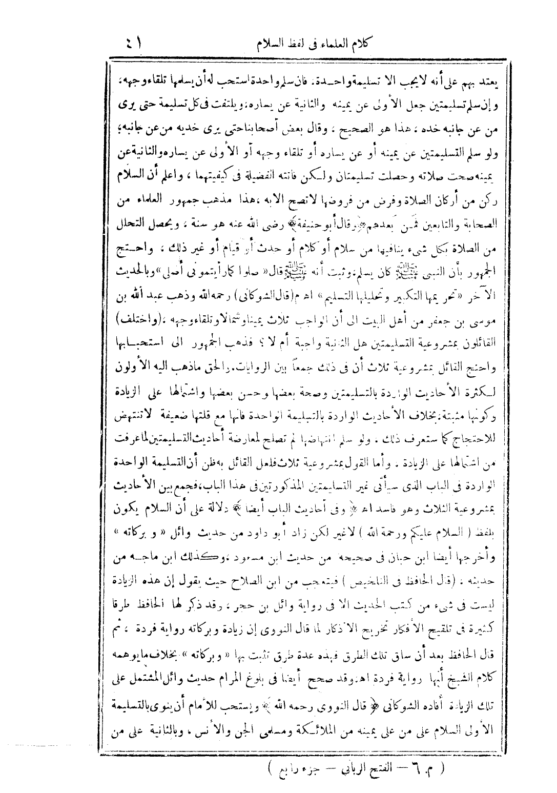 يعتد بهم على أنه لا يجب إلا تسليمة واحدة. فإن سلم واحدة استحب له أن يسلمها تلقاء وجهه، وإن سلم تسليمتين جعل الأولى عن يمينه والثانية عن يساره، ويلتفت في كل تسليمة حتى يرى من عن جانبه خده، هذا هو الصحيح. وقال بعض أصحابنا: حتى يرى خديه من على جانبه، ولو سلم التسلمتين عن يمينه أو عن يساره أو تلقاء وجهه أو الأولى عن يساره والثانية عن يمينه صحت صلاته وحصلت تسليمتان ولكن فاتته الفضيلة في كيفيتهما، واعلم أن السلام ركن من أركان الصلاة وفرض من فروضها لا تصح إلا به، هذا مذهب جمهور العلماء من الصحابة والتابعين فمن بعدهم. وقال أبو حنيفة: رضي الله عنه: هو سنة، ويحصل التحلل من الصلاة بكل شئ ينافيها من سلام أو كلام أو حدث أو قيام أو غير ذلك، واحتج الجمهور بأن النبي صلى الله عليه وسلم كان يسلم وثبت أنه صلى الله عليه وسلم قال: «صلوا كما رأيتموني أصلي» وبالحديث الآخر «تحريمها التكبير وتحليلها التسليم» اهـ. م. قال الشوكاني رحمه الله: وذهب عبد الله بن موسى بن جعفر من أهل البيت إلى أن الواجب ثلاث يمينًا وشمالاً وتلقاء وجهه، واختلف القائلون بمشروعية التسليمتين: هل الثانية واجبة أم لا؟ فذهب الجمهور إلى استحبابها، واحتج القائل بمشروعية ثلاث أن في ذلك جمعًا بين الروايات. والحق ما ذهب إليه الأولون لكثرة الأحاديث الواردة بالتسليمتين وصحة بعضها وحسن بعضها واشتمالها على الزيادة وكونها مثبتة، بخلاف الأحاديث الواردة بالتسليمة الواحدة فإنها مع قلتها ضعيفة لا تنتهض للاحتجاج كما ستعرف ذلك، ولو سلم انتهاضها لم تصلح لمعارضة أحاديث التسليمتين لما عرفت من اشتمالها على الزيادة. وأما القول بمشروعية ثلاث فلعل القائل به ظن أن التسليمة الواحدة الواردة في الباب الذي سيأتي غير التسليمتين المذكورتين في هذا الباب، فجمع بين الأحاديث بمشروعية الثلاث وهو فاسد. اهـ. وفي أحاديث الباب أيضًا دلالة على أن السلام يكون لفظ «السلام عليكم ورحمة الله» لا غير، لكن زاد أبو داود من حديث وائل «وبركاته» وأخرجها أيضًا ابن حبان في صحيحه من حديث ابن مسعود، وكذلك ابن ماجه من حديثه. قال الحافظ في (التلخيص): فيتعجب من ابن الصلاح حيث يقول: إن هذه الزيادة ليست في شيء من كتب الحديث إلا في رواية وائل بن حجر. وقد ذكر لها الحافظ طرقًا كثيرة في (تلقيح الأفكار تخريج الأذكار) لما قال النووي: إن زيادة «وبركاته» رواية فردة، ثم قال الحافظ بعد أن ساق تلك الطرق: فهذه عدة طرق تثبت بها «وبركاته» بخلاف ما يوهمه كلام الشيخ أنها رواية فردة. اهـ. وقد صحح أيضًا في (بلوغ المرام) حديث وائل المشتمل على تلك الزيادة. أفاده الشوكاني. قال النووي رحمه الله: ويستحب للإمام أن ينوي بالتسليمة الأولى السلام على من على يمينه من الملائكة ومسلمي الجن والإنس، وبالثانية على من