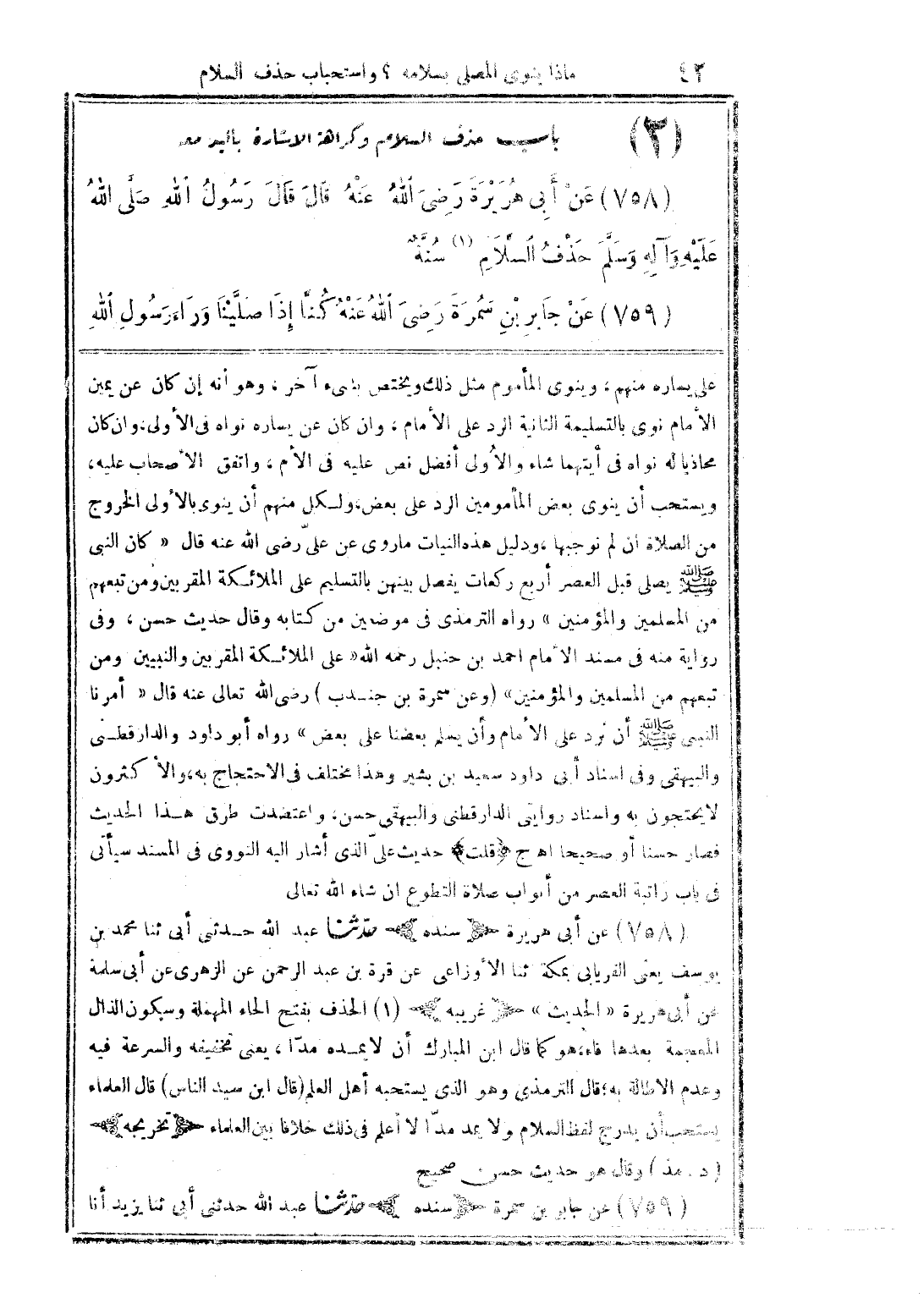 2 - باب حذف السلام وكراهة الإشارة باليد معه 758 - عن أبي هريرة رضي الله عنه قال: قال رسول الله صلى الله عليه وآله وسلم: حذف السلام (1) سنة. 759 - عن جابر بن سمرة رضي الله عنه: كنا إذا صلينا وراء رسول الله