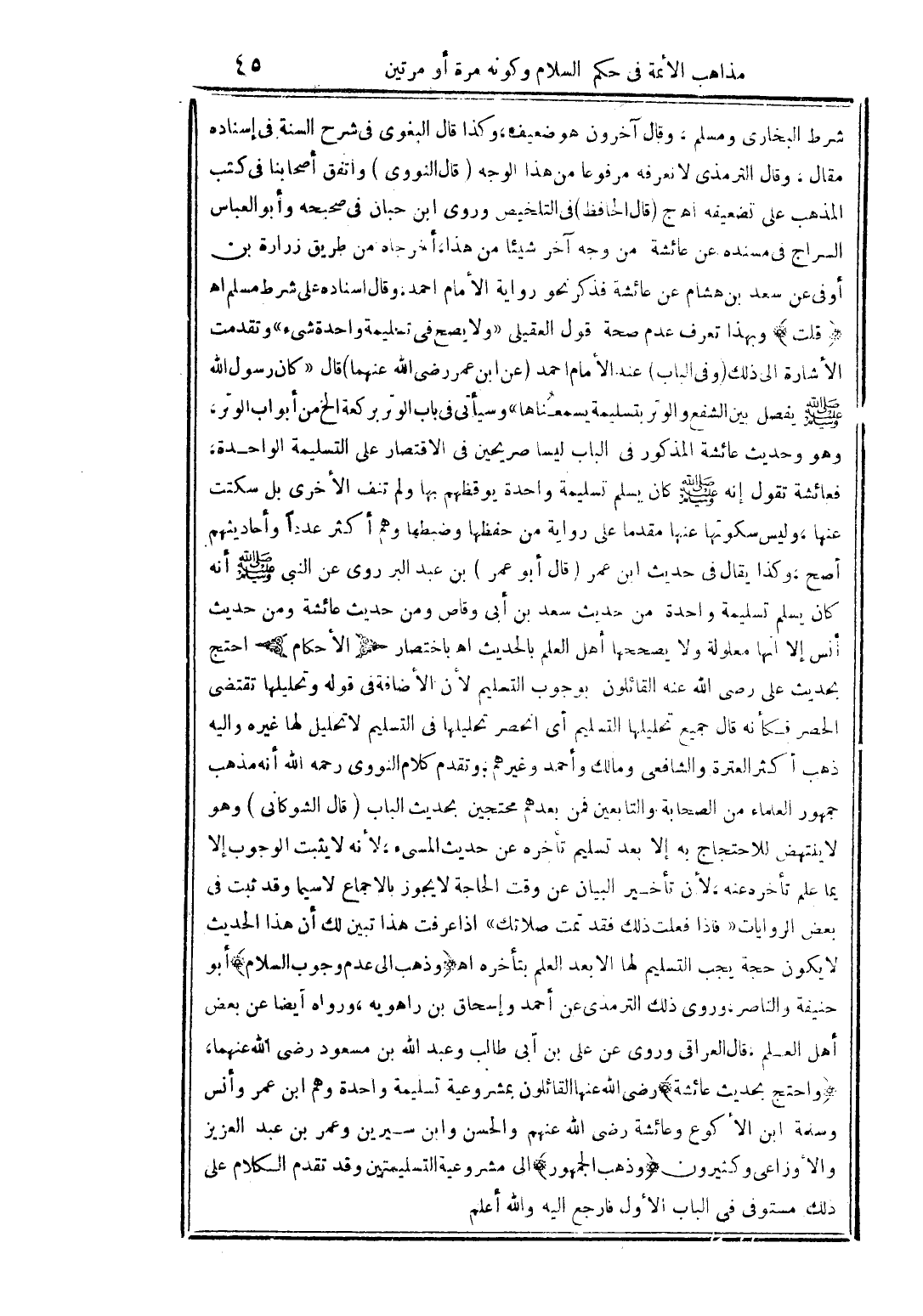شرط البخاري ومسلم، وقال آخرون: هو ضعيف، وكذا قال البغوي في (شرح السنة): في إسناده مقال، وقال الترمذي: لا نعرفه مرفوعًا من هذا الوجه. قال النووي: واتفق أصحابنا في كتب المذهب على تضعيفه. اهـ. ج. قال الحافظ في (التلخيص): وروى ابن حبان في صحيحه وأبو العباس السراج في مسنده عن عائشة من وجه آخر شيئًا من هذا، أخرجاه من طريق زرارة بن أوفى عن سعد بن هشام عن عائشة فذكر نحو رواية الإمام أحمد. وقال: إسناده على شرط مسلم. اهـ. قلت: وبهذا تعرف عدم صحة قول العقيلي: «ولا يصح في تسليمة واحدة شيء» وتقدمت الإشارة إلى ذلك. وفي الباب عند الإمام أحمد عن ابن عمر رضي الله عنهما قال: «كان رسول الله صلى الله عليه وسلم يفصل بين الشفع والوتر بتسليمة يسمعناها» وسيأتي في باب الوتر بركعة الخ. من أبواب الوتر. وهو وحديث عائشة المذكور في الباب ليسا صريحين في الاقتصار على التسليمة الواحدة، فعائشة تقول: إنه صلى الله عليه وسلم كان يسلم تسليمة واحدة يوقظهم بها ولم تنف الأخرى بل سكتت عنها، وليس سكوتها عنها مقدمًا على رواية من حفظها وضبطها وهم أكثر عددًا وأحاديثهم أصح، وكذا يقال في حديث ابن عمر. قال أبو عمر بن عبد البر: روي عن النبي صلى الله عليه وسلم أنه كان يسلم تسليمة واحدة من حديث سعد بن أبي وقاص ومن حديث عائشة ومن حديث أنس إلا أنها معلولة ولا يصححها أهل العلم بالحديث. اهـ باختصار. (الأحكام) احتج بحديث علي رضي الله عنه القائلون بوجوب التسليم، لأن الإضافة في قوله «وتحليلها» تقتضي الحصر، فكأنه قال جميع تحليلها التسليم، أي انحصر تحليلها في التسليم لا تحليل لها غيره، وإليه ذهب أكثر العترة والشافعي ومالك وأحمد وغيرهم. وتقدم كلام النووي رحمه الله أنه مذهب جمهور العلماء من الصحابة والتابعين فمن بعدهم محتجين بحديث الباب. قال الشوكاني: وهو لا ينتهض للاحتجاج به إلا بعد تسليم تأخره عن حديث المسيء، لأنه لا يثبت الوجوب إلا بما علم تأخره عنه، لأن تأخير البيان عن وقت الحاجة لا يجوز بالإجماع لا سيما وقد ثبت في بعض الروايات «فإذا فعلت ذلك فقد تمت صلاتك» إذا عرفت هذا تبين لك أن هذا الحديث لا يكون حجة يجب التسليم لها إلا بعد العلم بتأخره. اهـ. وذهب إلى عدم وجوب السلام أبو حنيفة والناصر، وروى ذلك الترمذي عن أحمد وإسحاق بن راهويه، ورواه أيضًا عن بعض أهل العلم. قال العراقي: وروي عن علي بن أبي طالب وعبد الله بن مسعود رضي الله عنهما. واحتج بحديث عائشة رضي الله عنها القائلون بمشروعية تسليمة واحدة، وهم ابن عمر وأنس وسلمة بن الأكوع وعائشة رضي الله عنهم والحسن وابن سيرين وعمر بن عبد العزيز والأوزاعي وكثيرون. وذهب الجمهور إلى مشروعية التسليمتين، وقد تقدم الكلام على ذلك مستوفى في الباب الأول فارجع إليه والله أعلم.