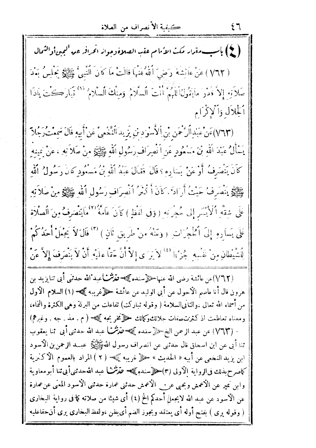 762 - عن عائشة رضي الله عنها (سنده) حدثنا عبد الله حدثني أبي ثنا يزيد بن هارون قال أنا عاصم الأحول عن أبي الوليد عن عائشة. (غريبه) 1 - السلام الأول من أسماء الله تعالى، والثاني السلامة. وقوله «تباركت» تفاعلت من البركة، وهي الكثرة والنماء. ومعناه تعاظمت إذ كثرت صفات جلالك وكمالك. (تخريجه) (م. مذ. جه. وغيرهم) 763 - عن عبد الرحمن الخ. (سنده) حدثنا عبد الله حدثني أبي ثنا يعقوب ثنا أبي عن ابن إسحاق قال: حدثني عن انصراف رسول الله صلى الله عليه وسلم عبد الرحمن بن الأسود بن يزيد النخعي عن أبيه (الحديث). (غريبه) 2 - المراد بالعموم الأكثرية كما صرح بذلك في الرواية الأولى. (سنده) 3 - حدثنا عبد الله حدثني أبي ثنا أبو معاوية وابن نمير عن الأعمش ويحيى عن الأعمش حدثني عمارة حدثني الأسود المعنى عن عمارة عن الأوسد عن عبد الله لا يجعل أحدكم الخ. 4 - أي شيئًا من صلاته كما في رواية البخاري. وقوله «يرى» بفتح أوله أي يعتقد ويجوز الضم أي يظن، ولفظ البخاري «يرى أن حقًا عليه