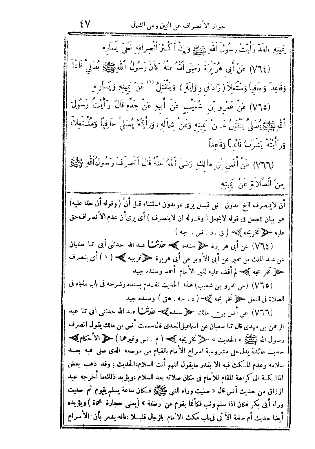 يمينه، لقد رأيت رسول الله صلى الله عليه وسلم وإن أكثر انصرافه لعلى يساره. 764 - عن أبي هريرة رضي الله عنه كان رسول الله صلى الله عليه وسلم يصلي قائمًا وقاعدًا وحافيًا ومنتعلاً (زاد في رواية «وينفتل (1) عن يمينه ويساره»). 765 - عن عمرو بن شعيب عن أبيه عن جده قال: رأيت رسول الله صلى الله عليه وسلم يصلي ينفتل عن يمينه وعن شماله، ورأيته يصلي حافيًا ومنتعلاً، ورأيته يشرب قائمًا وقاعدًا. 766 - عن أنس بن مالك رضي الله عنه قال: انصرف رسول الله صلى الله عليه وسلم من الصلاة عن يمينه.