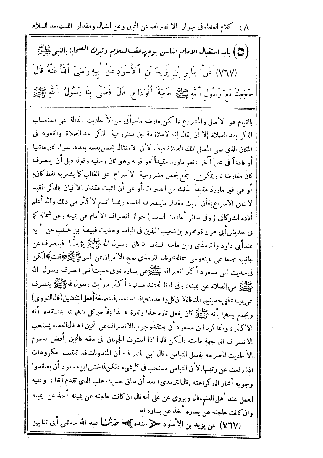 5 - باب استقبال الإمام الناس بوجهه عقب السلام وتبرك الصحابة بالنبي صلى الله عليه وسلم 767 - عن جابر بن يزيد بن الأسود عن أبيه رضي الله عنه قال: حججنا مع رسول الله صلى الله عليه وسلم حجة الوداع، قال: فصلى بنا رسول الله صلى الله عليه وسلم