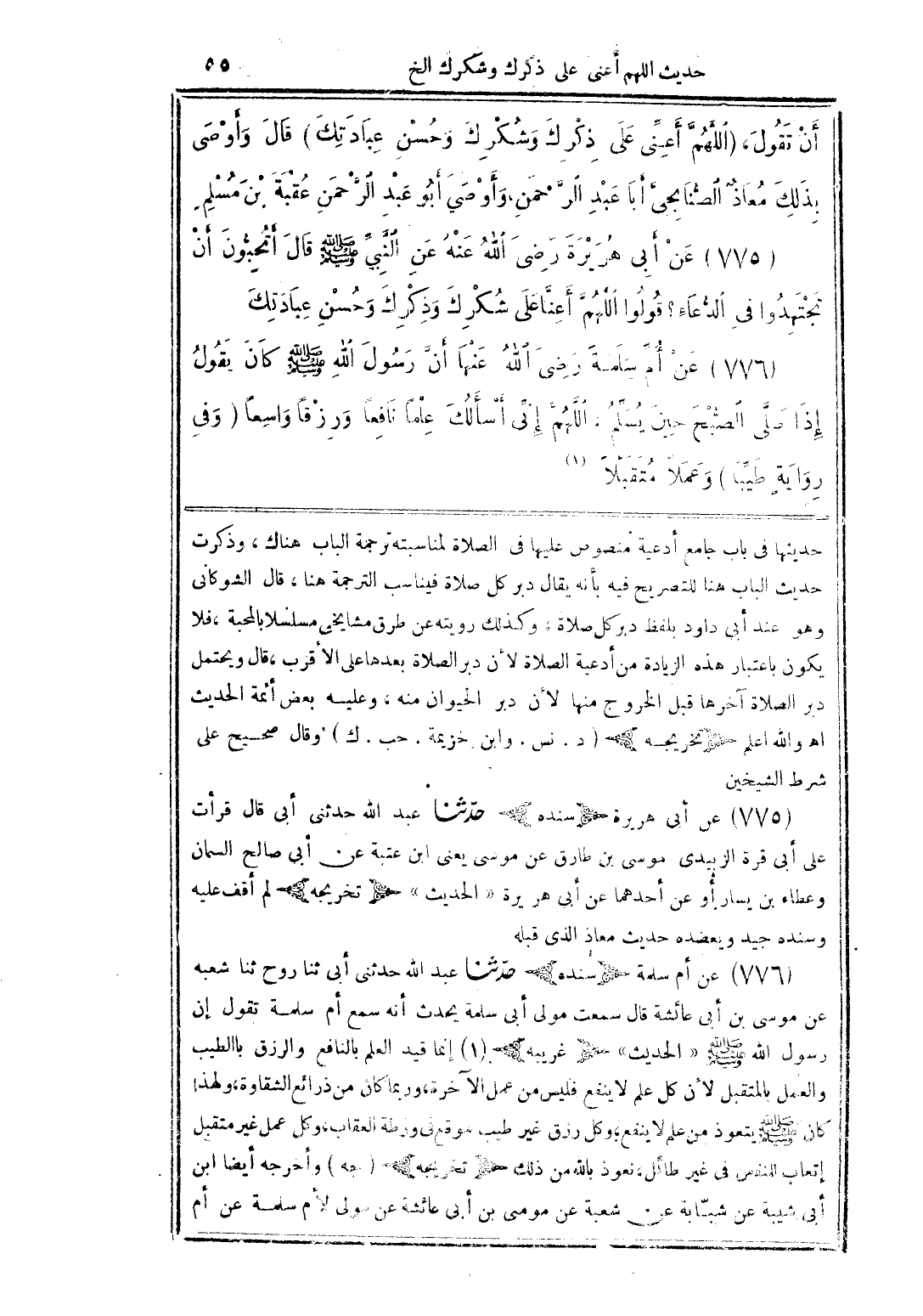 حديثها في باب جامع أدعية منصوص عليها في الصلاة لمناسبته ترجمة الباب هناك، وذكرت حديث الباب هنا للتصريح فيه بأنه يقال دبر كل صلاة فيناسب الترجمة هنا، قال الشوكاني: وهو عند أبي داود بلفظ «دبر كل صلاة»، وكذلك رويته عن طرق مشايخى مسلسلاً بالمحبة، فلا يكون باعتبار هذه الزيادة من أدعية الصلاة لأن دبر الصلاة بعدها على الأقرب، قال: ويحتمل دبر الصلاة آخرها قبل الخروج منها لأن دبر الحيوان منه، وعليه بعض أئمة الحديث. اهـ. والله أعلم. (تخريجه) (د. نس. وابن خزيمة. حب. ك) وقال صحيح على شرط الشيخين. 775 - عن أبي هريرة (سنده) حدثنا عبد الله حدثني أبي قال قرأت على أبي قرة الزبيدي موسى بن طارق عن موسى يعني ابن عتبة عن صالح السمان وعطاء بن يسار أو عن أحدهما عن أبي هريرة (الحديث). (تخريجه) لم أقف عليه، وسنده جيد، ويعضده حديث معاذ الذي قبله. 776 - عن أم سلمة (سنده) حدثنا عبد الله حدثني أبي ثنا روح ثنا شعبة عن موسى بن أبي عائشة قال سمعت مولى أبي سلمة يحدث أنه سمع أم سلمة تقول: إن رسول الله صلى الله عليه وسلم (الحديث). (غريبه) 1 - إنما قيد العلم بالنافع والرزق بالطيب والعمل بالمتقبل لأن كل علم لا ينفع فليس من عمل الآخرة وربما كان من ذرائع الشقاوة، ولهذا كان صلى الله عليه وسلم يتعوذ من علم لا ينفع، ولك رزق غير طيب موقع في ورطة العقاب، وكل عمل غير متقبل إتعاب للنفس في غير طائل، نعوذ بالله من ذلك. (تخريجه) (جه) وأخرجه أيضًا ابن أبي شيبة عن شبابة عن شعبة عن موسى بن أبي عائشة عن مولى لأم سلمة عن أم