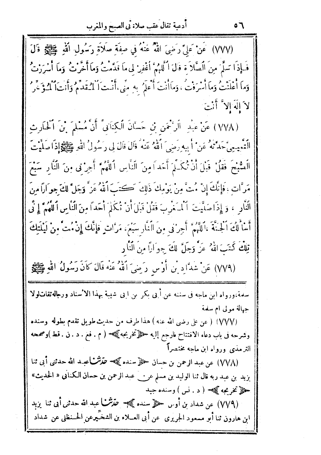 777 - عن علي رضي الله عنه في صفة صلاة رسول الله صلى الله عليه وسلم قال: فإذا سلم من الصلاة قال: اللهم اغفر لي ما قدمت وما أخرت وما أسررت وما أعلنت وما أسرفت وما أنت أعلم به مني، أنت المقدم وأنت المؤخر لا إله إلا أنت. 778 - عن عبد الرحمن بن حسان الكناني أن مسلم بن الحارث التميمي حدثه عن أبيه رضي الله عنه قال: قال لي رسول الله صلى الله عليه وسلم: إذا صليت الصبح فقل قبل أن تكلم أحدًا من الناس: اللهم أجرني من النار سبع مرات، فإنك إن مت من يومك ذلك كتب الله عز وجل لك جوارًا من النار، وإذا صليت المغرب فقل قبل أن تكلم أحدًا من الناس: اللهم إني أسألك الجنة، اللهم أجرني من النار سبع مرات، فإنك إن مت من ليلتك تلك كتب الله عز وجل لك جوارًا من النار. 779 - عن شداد بن أوس رضي الله عنه قال: كان رسول الله صلى الله عليه وسلم