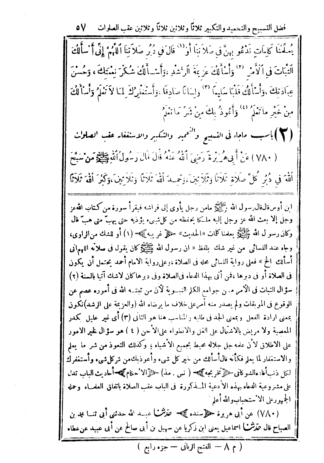 4 - هو سؤال لخير الأمور على الإطلاق لأن علمه جل جلاله محيط بجميع الأشياء، وكذلك التعوذ من شر ما يعلم والاستغفار لما يعلم، فكأنه قال: أسألك من خير كل شيء وأعوذ بك من شر كل شيء وأستغفرك لكل ذنب. أفاده الشوكاني. (تخريجه) (نس. مذ) (الأحكام) أحاديث الباب تدل على مشروعية الدعاء بهذه الأدعية المذكورة في الباب عقب الصلاة باتفاق العلماء، وحمله الجمهور على الاستحباب والله أعلم. 780 - عن أبي هريرة (سنده) حدثنا عبد الله حدثني أبي ثنا محمد بن الصباح قال حدثينا إسماعيل يعني ابن زكريا عن سهيل بن أبي صالح عن أبي عبيد عن عطاء