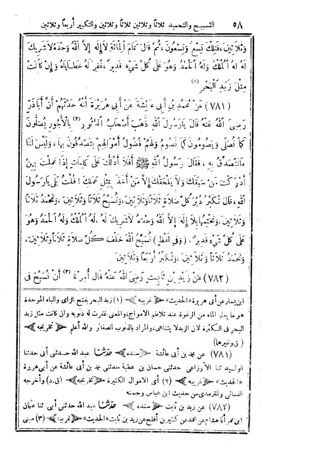 وثلاثين، فتلك تسع وتسعون، ثم قال: تمام المائة لا إله إلا الله وحده لا شريك له، له الملك وله الحمد، وهو على كل شيء قدير، غفر له خطاياه وإن كانت مثل زبد البحر (1). 781 - عن محمد بن أبي عائشة عن أبي هريرة أنه حدثهم أن أبا ذر رضي الله عنه قال: يا رسول الله ذهب أصحاب الدثور (2) بالأجور يصلون كما نصلي ويصومون كما نصوم ولهم فضول أموالهم يتصدقون بها، وليس لنا ما نتصدق به، فقال رسول الله صلى الله عليه وسلم: أفلا أدلك على كلمات إذا عملت بهن أدركت من سبقك ولا يلحقك إلا من أخذ بمثل عملك؟ قلت: بلى يا رسول الله. قال: تكبر دبر كل صلاة ثلاثًا وثلاثين، وتسبح ثلاثًا وثلاثين، وتحمد ثلاثًا وثلاثين، وتختمها بلا إله إلا الله وحده لا شريك له، له الملك وله الحمد وهو على كل شيء قدير، (وفي لفظ «تسبح الله خلف كل صلاة ثلاثًا وثلاثين، وتحمد ثلاثًا وثلاثين، وتكبر أربعًا وثلاثين»). 782 - عن زيد بن ثابت رضي الله عنه قال: أمرنا (3) أن نسبح في