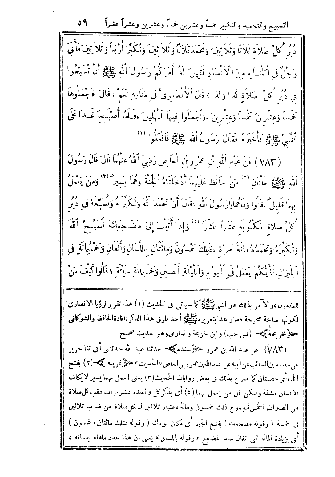 دبر كل صلاة ثلاثًا وثلاثين، وتحمد ثلاثًا وثلاثين، وتكبر أربعًا وثلاثين. فأتى رجل في المنام من الأنصار، فقيل له: أمركم رسول الله صلى الله عليه وسلم أن تسبحوا في دبر كل صلاة كذا وكذا؟ قال الأنصاري في منامه: نعم. قال: فاجعلوها خمسًا وعشرين خمسًا وعشرين، واجعلوا فيها التهليل، فلما أصبح غدا على النبي صلى الله عليه وسلم فأخبره فقال رسول الله صلى الله عليه وسلم: فافعلوا (1). 783 - عن عبد الله بن عمرو بن العاص رضي الله عنهما قال: قال رسول الله صلى الله عليه وسلم: خلتان (2) من حافظ عليهما أدخلتاه الجنة، وهما يسير (3)، ومن يعمل بهما قليل. قالوا: وما هما يا رسول الله؟ قال: أن تحمد الله وتكبره وتسبحه في دبر كل صلاة مكتوبة عشرًا عشرًا (4)، وإذا أتيت إلى مضجعك تسبح الله وتكبره وتحمده مائة مرة. فتلك خمسون ومائتان باللسان وألفان وخمسمائة في الميزان، فأيكم يعمل في اليوم والليلة ألفين وخمسمائة سيئة؟ قالوا: كيف مَن