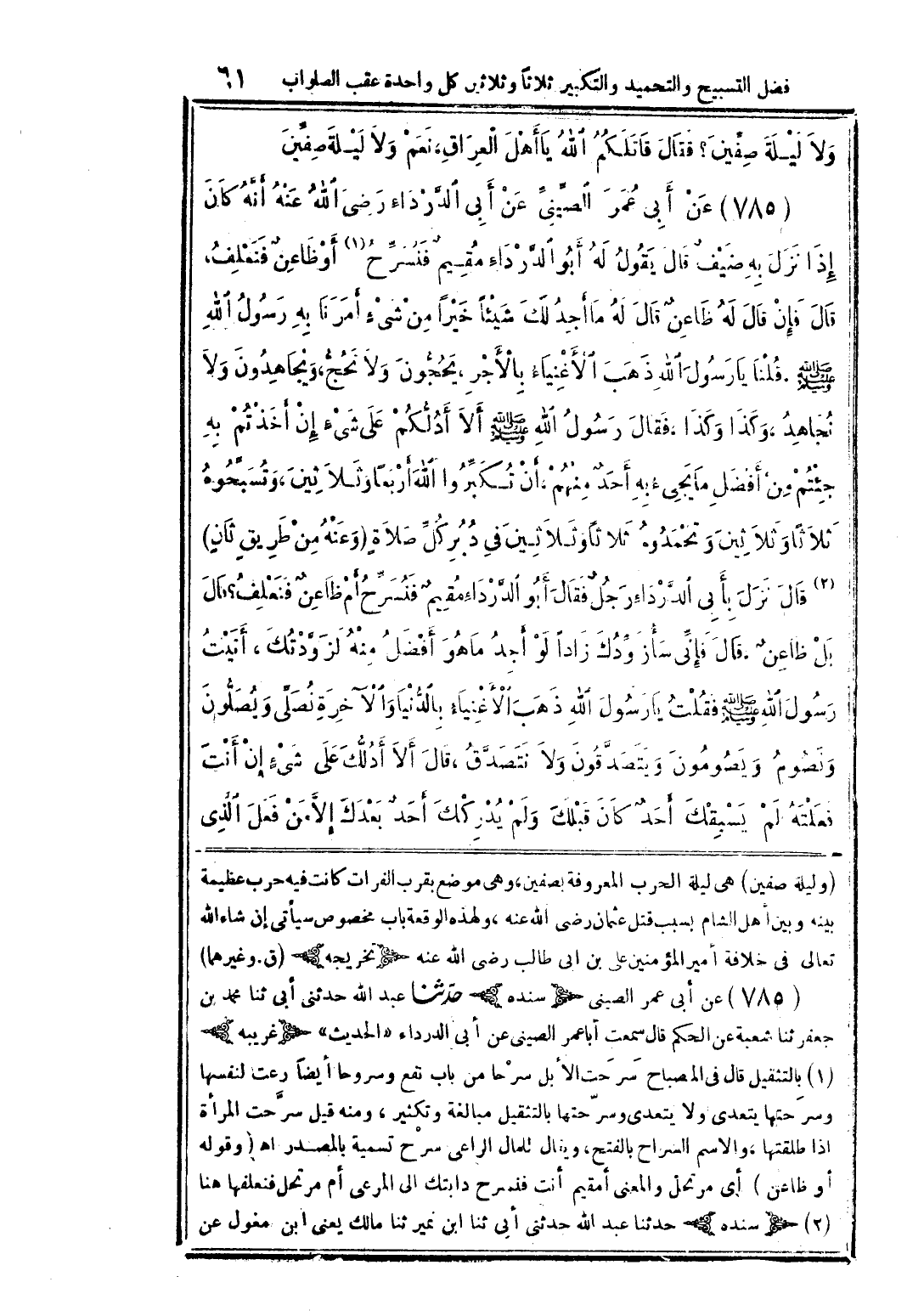 ولا ليلة صفين؟ فقال: قاتلكم الله يا أهل العراق، نعم ولا ليلة صفين. 785 - عن أبي عمر الصيني عن أبي الدرداء رضي الله عنه أنه كان إذا نزل به ضيف قال: يقول له أبو الدرداء: مقيم فنسرح (1) أو ظاعن فنعلف؟ قال: فإن قال: له: ظاعن، قال له: ما أجد لك شيئًا خيرًا من شيء أمرنا به رسول الله صلى الله عليه وسلم، قلنا: يا رسول الله ذهب الأغنياء بالأجر، يحجون ولا نحج، ويجاهدون ولا نجاهد، وكذا وكذا. فقال رسول الله صلى الله عليه وسلم: ألا أدلكم على شيء إن أخذتم به جئتم من أفضل ما يجيء به أحد منهم: أن تكبروا الله أربعًا وثلاثين، وتسبحوه ثلاثًا وثلاثين، وتحمدوه ثلاثًا وثلاثين في دبر كل صلاة. وعنه من طريق ثان (2) قال: نزل بأبي الدرداء رجل فقال أبو الدرداء: مقيم فنسرح أم ظاعن فنعلف؟ قال: بل ظاعن. قال: فإني سأزودك زادًا لو أجد ما هو أفضل منه لزودتك، أتيت رسول الله صلى الله عليه وسلم فقلت: يا رسول الله ذهب الأغنياء بالدنيا والآخرة، نصلي ويصلون، ونصوم ويصومون، ويتصدقون ولا نتصدق. قال: ألا أدلك على شيء إن أنت فعلته لم يسبقك أحد كان قبلك ولم يدركك أحد بعدك إلا من فعل الذي