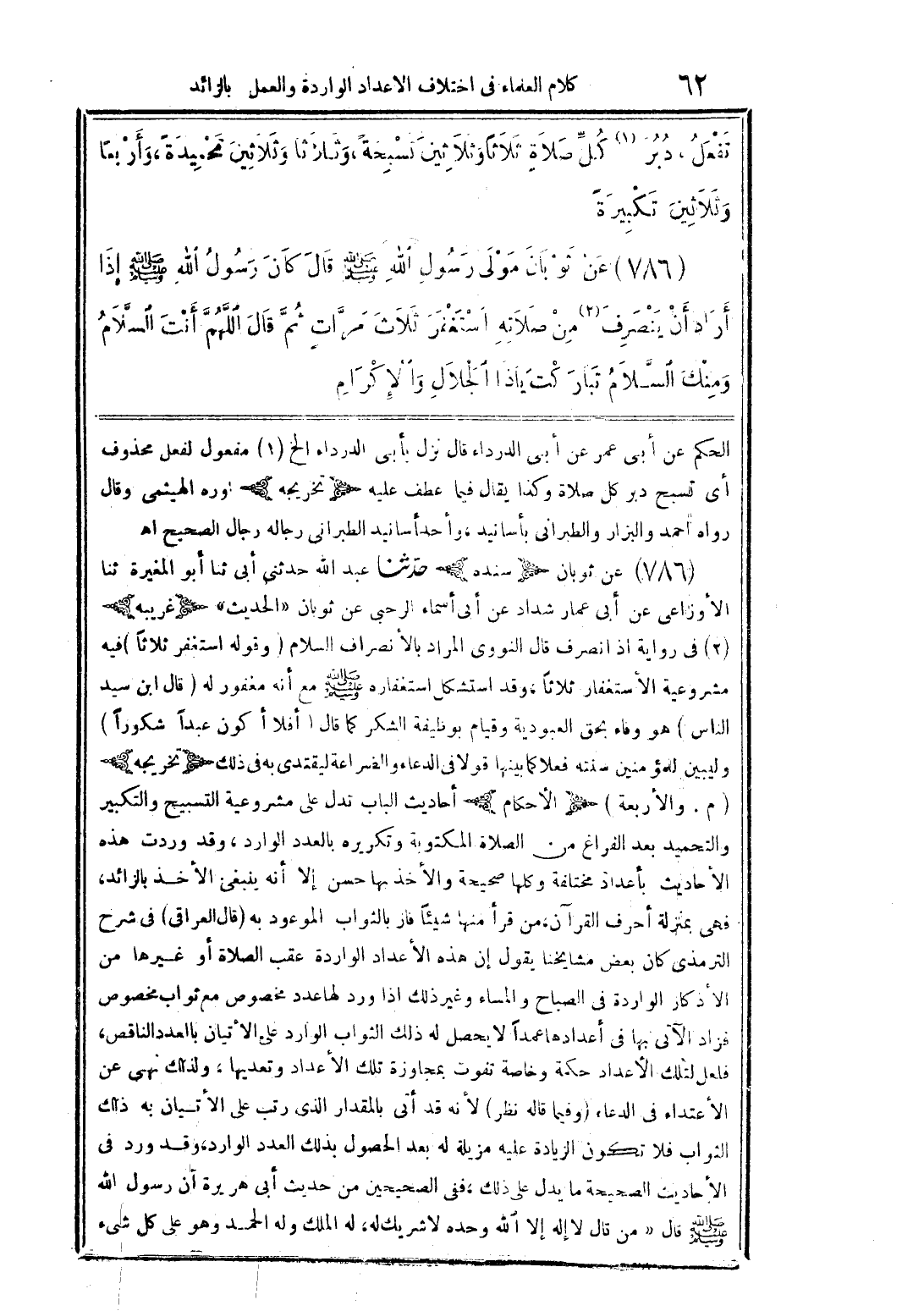 تفعل، دبر (1) كل صلاة ثلاثًا وثلاثين تسبيحة، وثلاثًا وثلاثين تحميدة، وأربعًا وثلاثين تكبيرة. 786 - عن ثوبان مولى رسول الله صلى الله عليه وسلم قال: كان رسول الله صلى الله عليه وسلم إذا أراد أن ينصرف (2) من صلاته استغفر ثلاث مرات ثم قال: اللهم أنت السلام ومنك السلام تباركت يا ذا الجلال والإكرام.