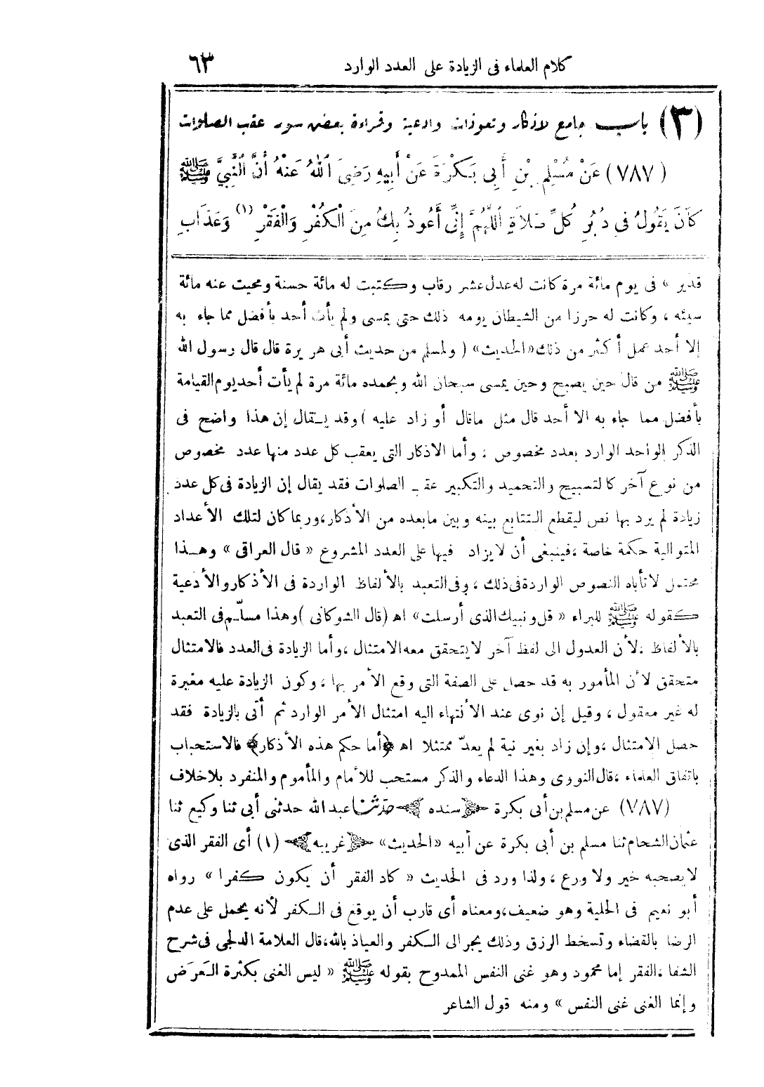قدير» في يوم مائة مرة كانت له عدل عشر رقاب، وكتبت له مائة حسنة، ومحيت عنه مائة سيئة، وكانت له حرزًا من الشيطان يومه ذلك حتى يمسي، ولم يأت أحد بأفضل مما جاء به إلا أحد عمل أكثر من ذلك (الحديث). ولمسلم من حديث أبي هريرة قال: قال رسول الله صلى الله عليه وسلم: من قال حين يصبح وحين يمسي: سبحان الله وبحمده مائة مرة لم يأت أحد يوم القيامة بأفضل مما جاء به إلا أحد قال مثل ما قال أو زاد عليه. وقد يقال: إن هذا واضح في الذكر الواحد الوارد بعدد مخصوص، وأما الأذكار التي يعقب كل عدد منها عدد مخصوص من نوع آخر كالتسبيح والتحميد والتكبير عقب الصلوات فقد يقال: إن الزيادة في كل عدد زيادة لم يرد بها نص ليقطع التتابع بينه وبين ما بعده من الأذكار، وربما كان لتلك الأعداد المتوالية حكمة خاصة، فينبغي أن لا يزاد فيها على العدد المشروع. قال العراقي: وهذا محتمل لا تأباه النصوص الواردة في ذلك، وفي التعبد بالألفاظ الواردة في الأذكار والأدعية كقوله صلى الله عليه وسلم للبراء: «قل ونبيك الذي أرسلت» اهـ. قال الشوكاني: وهذا مسلم في التعبد بالألفاظ، لأن العدول إلى لفظ آخر لا يتحقق معه الامتثال، وأما الزيادة في العدد فالامتثال متحقق لأن المأمور به قد حصل على الصفة التي وقع الأمر بها، وكون الزيادة عليه مغيرة له غير معقول، وقيل: إن نوى عند الانتهاء إليه امتثال الأمر الوارد ثم أتى بالزيادة فقد حصل الامتثال، وإن زاد بغير نية لم يعد ممتثلاً. اهـ. أما حكم هذه الأذكار، فالاستحباب باتفاق العلماء. قال النووي: وهذا الدعاء والذكر مستحب للإمام والمأموم والمنفرد بلا خلاف. 787 - عن مسلم بن أبي بكرة (سنده) حدثنا عبد الله حدثني أبي ثنا وكيع ثنا عثمان الشحام ثنا مسلم بن أبي بكرة عن أبيه (الحديث). (غريبه) 1 - أي الفقر الذي لا يصحبه خير ولا ورع، ولذا ورد في الحديث «كاد الفقر أن يكون كفرًا» رواه أبو نعيم في الحلية وهو ضعيف، ومعناه أي قارب أن يوقع في الكفر لأنه يحمل على عدم الرضا بالقضاء وتسخط الرزق، وذلك يجر إلى الكفر والعياذ بالله. قال العلامة الدلجي في (شرح الشفا): الفقر إما محمود وهو غنى النفس الممدوح بقوله صلى الله عليه وسلم: «ليس الغنى بكثرة العرض وإنما الغنى غنى النفس» ومنه قول الشاعر: