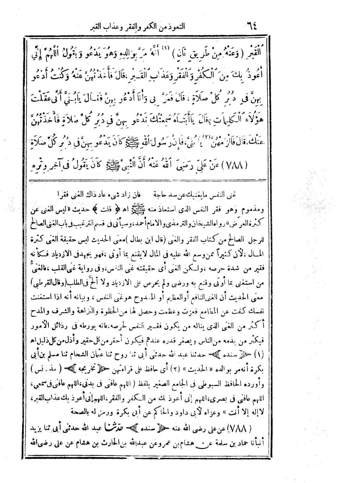 القبر. وعنه من طريق ثان (1) أنه مر بوالده وهو يدعو ويقول: اللهم إني أعوذ بك من الكفر والفقر وعذاب القبر. قال: فأخذتهن عنه، وكنت أدعو بهن في دبر كل صلاة. قال: فمر بي وأنا أدعو بهن فقال: يا بني أنّى عقلت هؤلاء الكلمات؟ قال: يا أبتاه سمعتك تدعو بهن في دبر كل صلاة فأخذتهن عنك. قال: فالزمهن (2) يا بني فإن رسول الله صلى الله عليه وسلم كان يدعو بهن في دبر كل صلاة. 788 - عن علي رضي الله عنه أن النبي صلى الله عليه وسلم كان يقول في آخر وتره.
