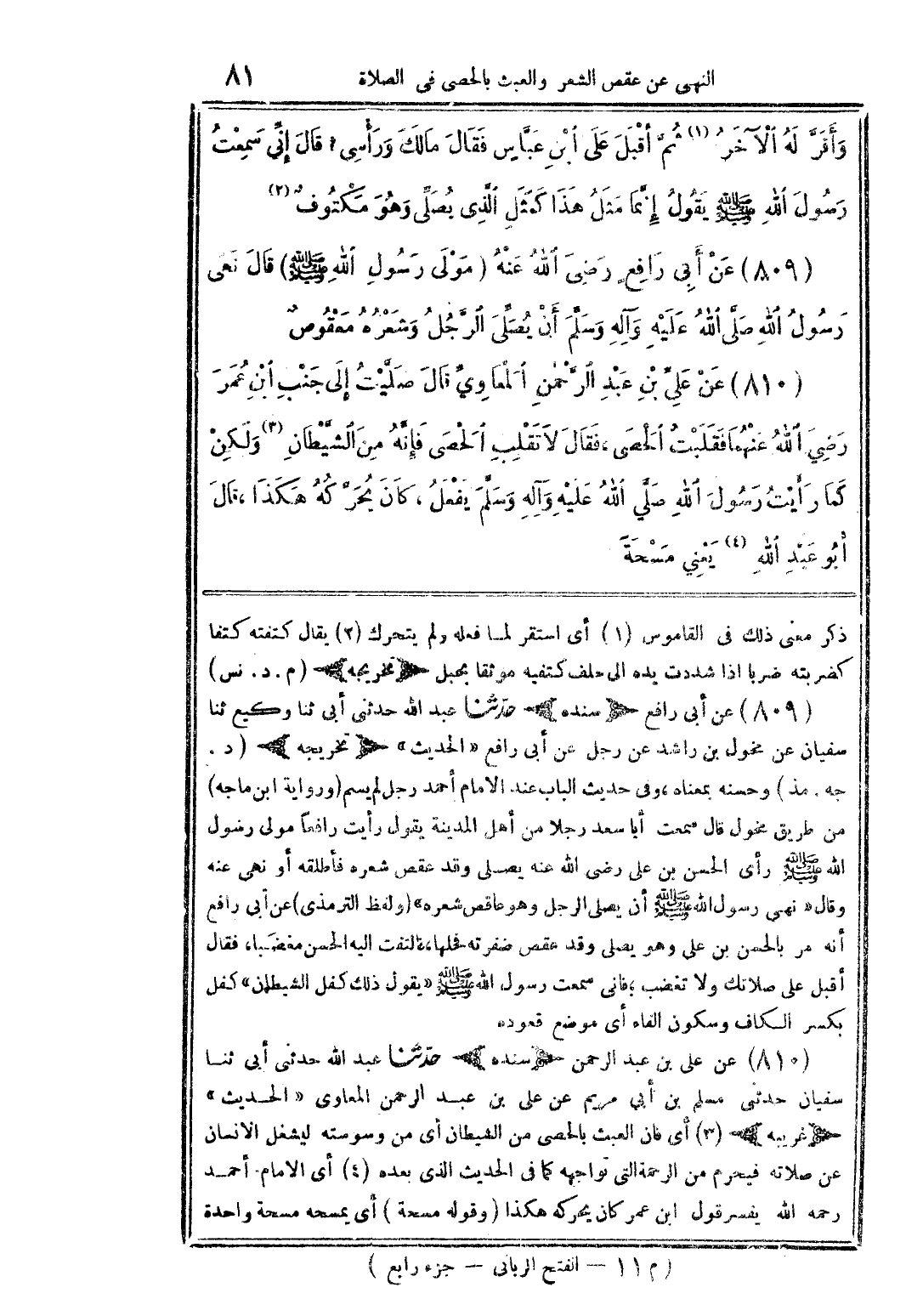 ذكر معنى ذلك في القاموس. 1 - أي استقر لما فعله ولم يتحرك. 2 - يقال كتفته كتفًا كضربته ضربًا إذا شددت يده إلى خلف كتفيه موثقًا بحبل. (تخريجه) (م. د. نس). 809 - عن أبي رافع (سنده) حدثنا عبد الله حدثني أبي ثنا وكيع ثنا سفيان عن مخول بن راشد عن رجل عن أبي رافع (الحديث). (تخريجه) (د. جه. مذ) وحسنه بمعناه. وفي حديث الباب عند الإمام أحمد رجل لم يسم. ورواية ابن ماجه من طريق مخول قال: سمعت أبا سعد رجلاً من أهل المدينة يقول: رأيت رافعًا مولى رسول الله صلى الله عليه وسلم رأى الحسن بن علي رضي الله عنه يصلي وقد عقص شعره فأطلقه أو نهى عنه وقال: «نهى رسول الله صلى الله عليه وسلم أن يصلي الرجل وهو عاقص شعره»، ولفظ الترمذي عن أبي رافع أنه مر بالحسن بن علي وهو يصلي وقد عقص ضفرته فحلها، فالتفت إليه الحسن مغضبًا، فقال: أقبل على صلاتك ولا تغضب؛ فإني سمعت رسول الله صلى الله عليه وسلم يقول: ذلك كفل الشيطان». كفل بكسر الكاف وسكون الفاء أي موضع قعوده. 810 - عن علي بن عبد الرحمن (سنده) حدثنا عبد الله حدثني أبي ثنا سفيان حدثني مسلم بن أبي مريم عن علي بن عبد الرحمن المعاوي (الحديث). (غريبه) 3 - أي فإن العبث بالحصى من الشيطان أي من وسوسته ليشغل الإنسان عن صلاته فيحرم من الرحمة التي تواجهه كما في الحديث الذي بعده. 4 - أي الإمام أحمد رحمه الله يفسر قول ابن عمر «كان يحركه هكذا». وقوله «مسحة» أي يمسحه مسحة واحدة