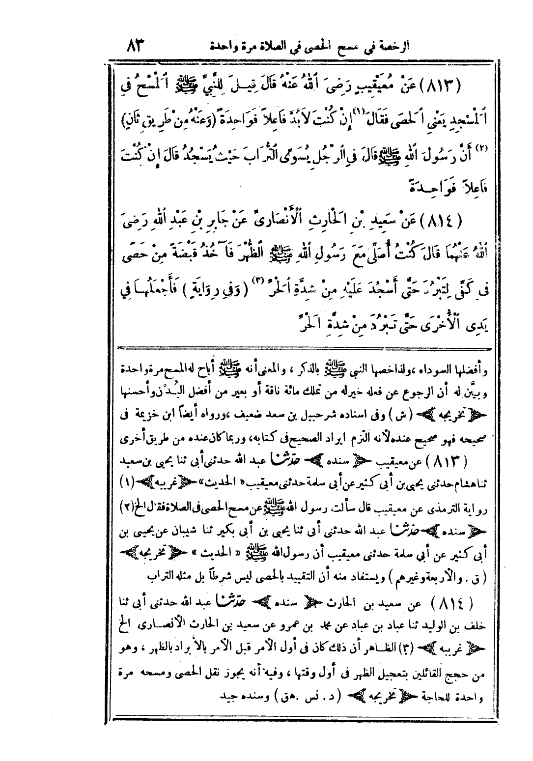 وأفضلها السوداء، ولذا خصها النبي صلى الله عليه وسلم بالذكر، والمعنى أنه صلى الله عليه وسلم أباح له المسح مرة واحدة وبين له أن الرجوع عن فعله خير له من تملك مائة ناقة أو بعير من أفضل البُدن وأحسنها. (تخريجه) (ش) وفي إسناده شرحبيل بن سعد ضعيف، ورواه أيضًا ابن خزيمة في صحيحه فهو صحيح عنده لأنه التزم إيراد الصحيح في كتابه، وربما كان عنده من طريق أخرى. 813 - عن معيقيب (سنده) حدثنا عبد الله حدثني أبي ثنا يحيى بن سعيد ثنا هشام حدثني يحيى بن أبي كثير عن أبي سلمة حدثني معيقيب (الحديث). (غريبه) 1 - رواية الترمذي عن معيقيب قال: سألت رسول الله صلى الله عليه وسلم عن مسح الحصى في الصلاة فقال الخ. (سنده) 2 - حدثنا عبد الله حدثني أبي ثنا يحيى بن أبي بكير ثنا شيبان عن يحيى بن أبي كثير عن أبي سلمة حدثني معيقيب أن رسول الله صلى الله عليه وسلم (الحديث). (تخريجه) (ق. والأربعة وغيرهم) ويستفاد منه أن التقييد بالحصى ليس شرطًا بل مثله التراب. 814 - عن سعيد بن الحارث (سنده) حدثنا عبد الله حدثني أبي ثنا خلف بن الوليد ثنا عباد بن عباد عن محمد بن عمرو عن سعيد بن الحارث الأنصاري الخ. (غريبه) 3 - الظاهر أن ذلك كان في أول الأمر قبل الأمر بالإبراد بالظهر، وهو من حجج القائلين بتعجيل الظهر في أول وقتها، وفيه أنه يجوز نقل الحصى ومسحه مرة واحدة للحاجة. (تخريجه) (د. نس. هق) وسنده جيد