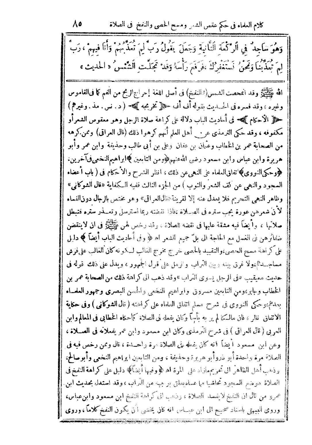 الله صلى الله عليه وسلم وقد انمحصت الشمس. و «النفخ» في أصل اللغة إخراج الريح من الفم كما في القاموس وغيره، وقد فسره في الحديث بقوله «أف أف». (تخريجه) (د. نس. مذ. وغيرهم). (الأحكام) في أحاديث الباب دلالة على كراهة صلاة الرجل وهو معقوص الشعر أو مكفوفه، وقد حكى الترمذي عن أهل العلم أنهم كرهوا ذلك. قال العراقي: وممن كرهه من الصحابة عمر بن الخطاب وعثمان بن عفان وعلي بن أبي طالب وحذيفة وابن عمر وأبو هريرة وابن عباس وابن مسعود رضي الله عنهم، ومن التابعين إبراهيم النخعي في آخرين. وحكى النووي اتفاق العلماء على النهي عن ذلك. انظر الشرح والأحكام في باب أعضاء السجود والنهي عن كف الشعر والثوب، من الجزء الثالث ففيه الكفاية. قال الشوكاني: وظاهر النهي التحريم فلا يعدل عنه إلا لقرينة. قال العراقي: وهو مختص بالرجال دون النساء لأن شعرهن عورة يجب ستره في الصلاة، فإذا نقضته ربما استرسل وتعذر ستره فتبطل صلاتها، وأيضًا فيه مشقة عليها في نقضه للصلاة، وقد رخص لهن صلى الله عليه وسلم في أن لا ينقضن ضفائرهن في الغسل مع الحاجة إلى بلّ جميع الشعر. اهـ. وفي أحاديث الباب أيضًا دليل على كراهة مسح الحصى، والتقييد بالحصى خرج مخرج الغالب لكونه كان الغالب على فرش مساجدهم، ولا فرق بينه وبين التراب والرمل على قول الجمهور، ويدل على ذلك قوله في حديث معيقيب «في الرجل يسوي التراب» وقد ذهب إلى كراهة ذلك من الصحابة عمر بن الخطاب وجابر، ومن التابعين مسروق وإبراهيم النخعي والحسن البصري وجمهور العلماء بعدهم، وحكى النووي في (شرح مسلم) اتفاق العلماء على كراهته. قال الشوكاني: وفي حكاية الاتفاق نظر، فإن مالكًا لم ير به بأسًا وكان يفعله في الصلاة كما حكاه الخطابي في (المعالم) وابن العربي. قال العراقي في (شرح الترمذي): وكان ابن مسعود وابن عمر يفعلانه في الصلاة، وعن ابن مسعود أيضًا أنه كان يفعله في الصلاة مرة واحدة، قال: وممن رخص فيه في الصلاة مرة واحدة أبو ذر وأبو هريرة وحذيفة، ومن التابعين إبراهيم النخعي وأبو صالح، وذهب أهل الظاهر إلى تحريم ما زاد على المرة. اهـ. وفيها أيضًا دليل على كراهة النفخ في الصلاة موضع السجود تحاشيًا مما عساه يعلق بوجهه من التراب، وقد استدل بحديث ابن عمرو من قال: إن النفخ لا يفسد الصلاة، وذهب إلى كراهة النفخ ابن مسعود وابن عباس، وروى البيهقي بإسناد صحيح إلى ابن عباس أنه كان يخشى أن يكون النفخ كلامًا، وروى