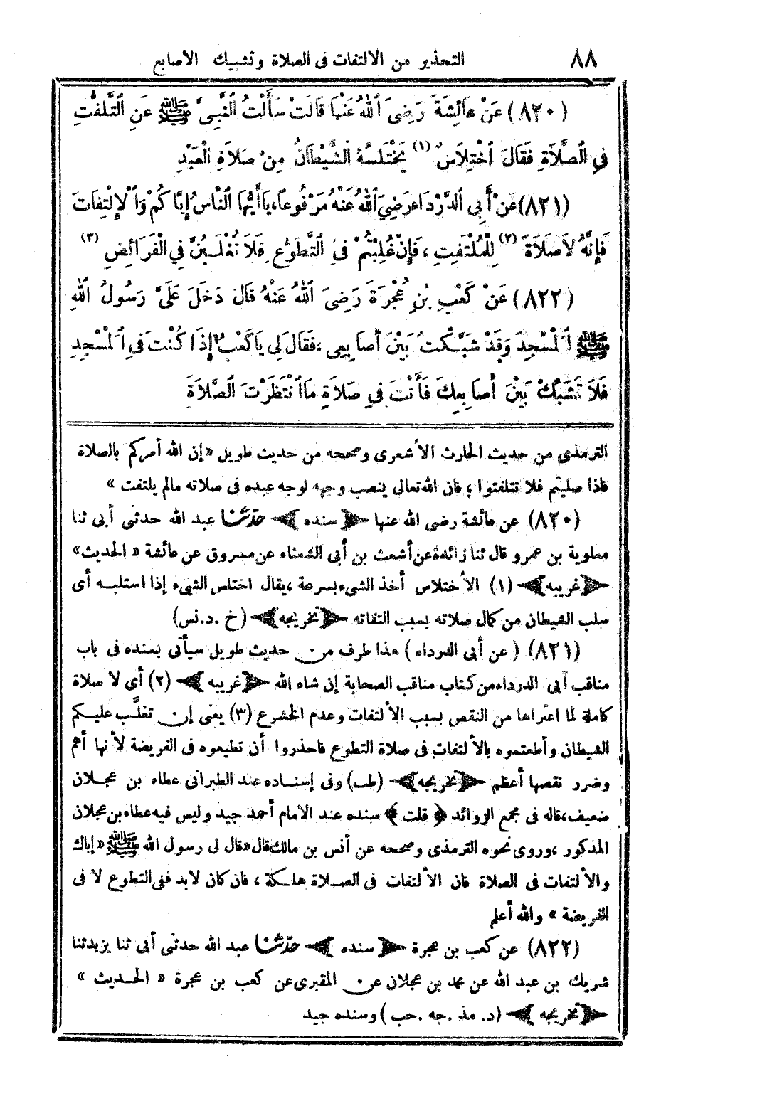821 - عن أبي الدرداء هذا طرف من حديث طويل سيأتي بسنده في باب مناقب أبي الدرداء من كتاب مناقب الصحابة إن شاء الله. (غريبه) 2 - أي لا صلاة كاملة لما اعتراها من النقص بسبب الالتفات وعدم الخشوع. 3 - يعني إن تغلب عليكم الشيطان وأطعتموه بالالتفات في صلاة التطوع فاحذروا أن تطيعوه في الفريضة لأنها أهم وضرر نقصها أعظم. (تخريجه) (طب) وفي إسناده عند الطبراني عطاء بن عجلان ضعيف، قاله في (مجمع الزوائد). قلت: سنده عند الإمام أحمد جيد وليس في عطاء بن عجلان المذكور، وروى نحوه الترمذي وصححه عن أنس بن مالك قال: قال لي رسول الله صلى الله عليه وسلم: «إياك والالتفات في الصلاة، فإن الالتفات في الصلاة هلكة، فإن كان لا بد ففي التطوع لا في الفريضة» والله أعلم. 822 - عن كعب بن عجرة (سنده) حدثنا عبد الله حدثني أبي ثنا يزيد ثنا شريك بن عبد الله عن محمد بن عجلان عن المقبري عن كعب بن عجرة (الحديث). (تخريجه) (د. مذ. جه. حب) وسنده جيد.