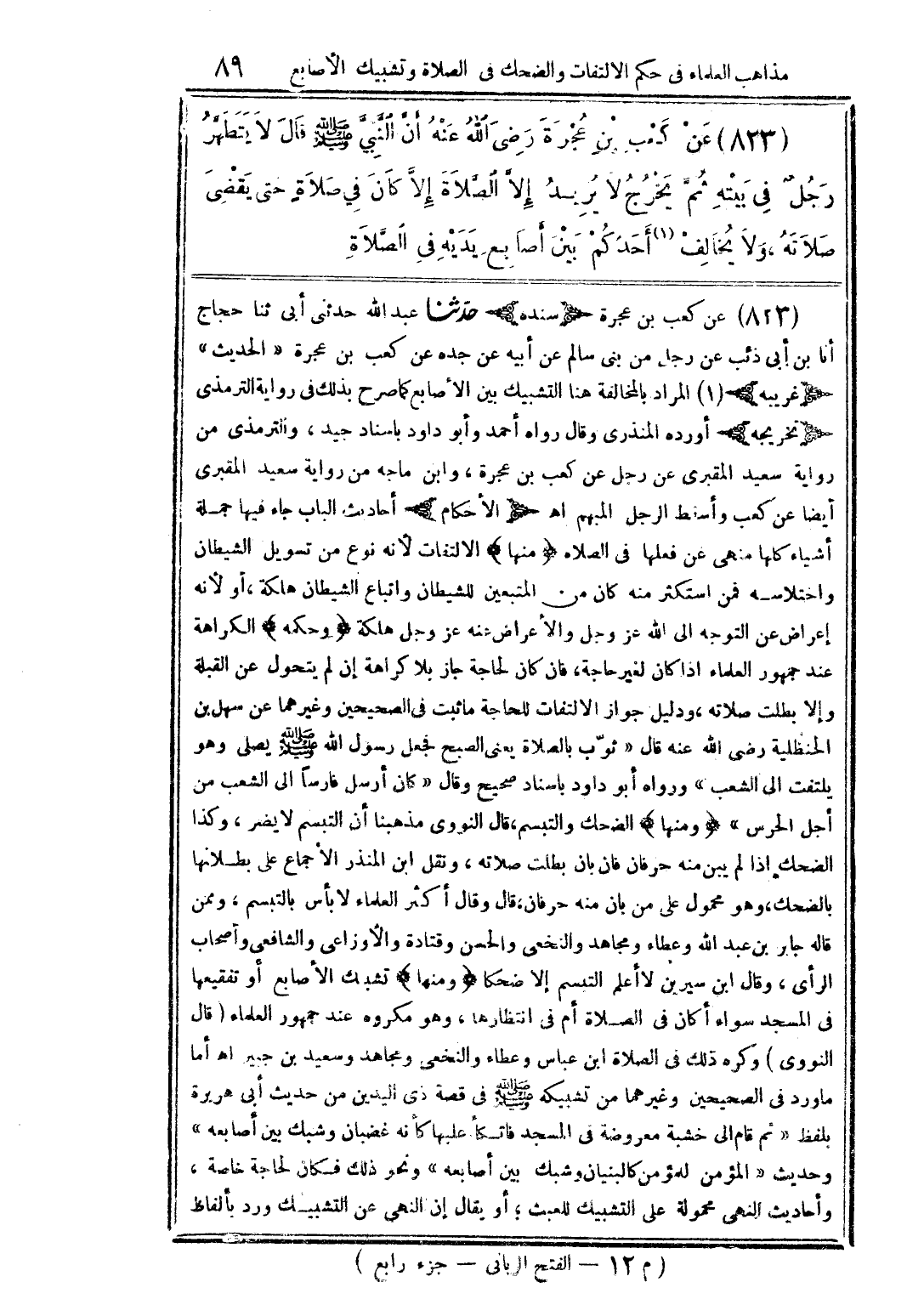 823 - عن كعب بن عجرة (سنده) حدثنا عبد الله حدثني أبي ثنا حجاج أنا بن أبي ذئب عن رجل من بني سالم عن أبيه عن جده عن كعب بن عجرة (الحديث). (غريبه) 1 - المراد بالمخالفة هنا التشبيك بين الأصابع كما صرح بذلك في رواية الترمذي. (تخريجه) أورده المنذري وقال: رواه أحمد وأبو داود بإسناد جيد، والترمذي من رواية سعيد المقبري عن رجل عن كعب بن عجرة، وابن ماجه من رواية سعيد المقبري أيضًا عن كعب وأسقط الرجل المبهم. اهـ. (الأحكام) أحاديث الباب جاء فيها جملة أشياء كلها منهي عن فعلها في الصلاة: منها: الالتفات لأنه نوع من تسويل الشيطان واختلاسه، فمن استكثر منه كان من المتبعين للشيطان واتباع الشيطان هلكة، أو لأنه إعراض عن التوجه إلى الله عز وجل والإعراض عنه عز وجل هلكة. وحكمه: الكراهة عند جمهور العلماء إذا كان لغير حاجة، فإن كان لحاجة جاز بلا كراهة إن لم يتحول عن القبلة وإلا بطلت صلاته، ودليل جواز الالتفات للحاجة ما ثبت في الصحيحين وغيرهما عن سهل بن الحنظلية رضي الله عنه قال: «ثوّب بالصلاة يعني الصبح فجعل رسول الله صلى الله عليه وسلم يصلي وهو يلتفت إلى الشعب» ورواه أبو داود بإسناد صحيح وقال: «كان أرسل فارسًا إلى الشعب من أجل الحرس». ومنها: الضحك والتبسم، قال النووي: مذهبنا أن التبسم لا يضر، وكذا الضحك إذا لم يبن منه حرفان فإن بان بطلت صلاته، ونقل ابن المنذر الإجماع على بطلانها بالضحك، وهو محمول على من باب منه حرفان، قال: وقال أكثر العلماء: لا بأس بالتبسم، وممن قاله جابر بن عبد الله وعطاء ومجاهد النخعي والحسن وقتادة والأوزاعي والشافعي وأصحاب الرأي، وقال ابن سيرين: لا أعلم التبسم إلا ضحكًا. ومنها: تشبيك الأصابع أو تفقيعها في المسجد سواء أكان في الصلاة أم في انتظارها، وهو مكروه عند جمهور العلماء. قال النووي: وكره ذلك في الصلاة ابن عباس وعطاء والنخعي ومجاهد وسعيد بن جبير. اهـ. أما ما ورد في الصحيحين وغيرهما من تشبيكه صلى الله عليه وسلم في قصة ذي اليدين من حديث أبي هريرة بلفظ «ثم قام إلى خشبة معروضة في المسجد فاتكأ عليها كأنه غضبان وشبك أصابعه» وحديث «المؤمن للمؤمن كالبنيان وشبك بين أصابعه» ونحو ذلك فكان لحاجة خاصة، وأحاديث النهي محمولة على التشبيك للعبث، أو يقال إن النهي عن التشبيك ورد بألفاظ
