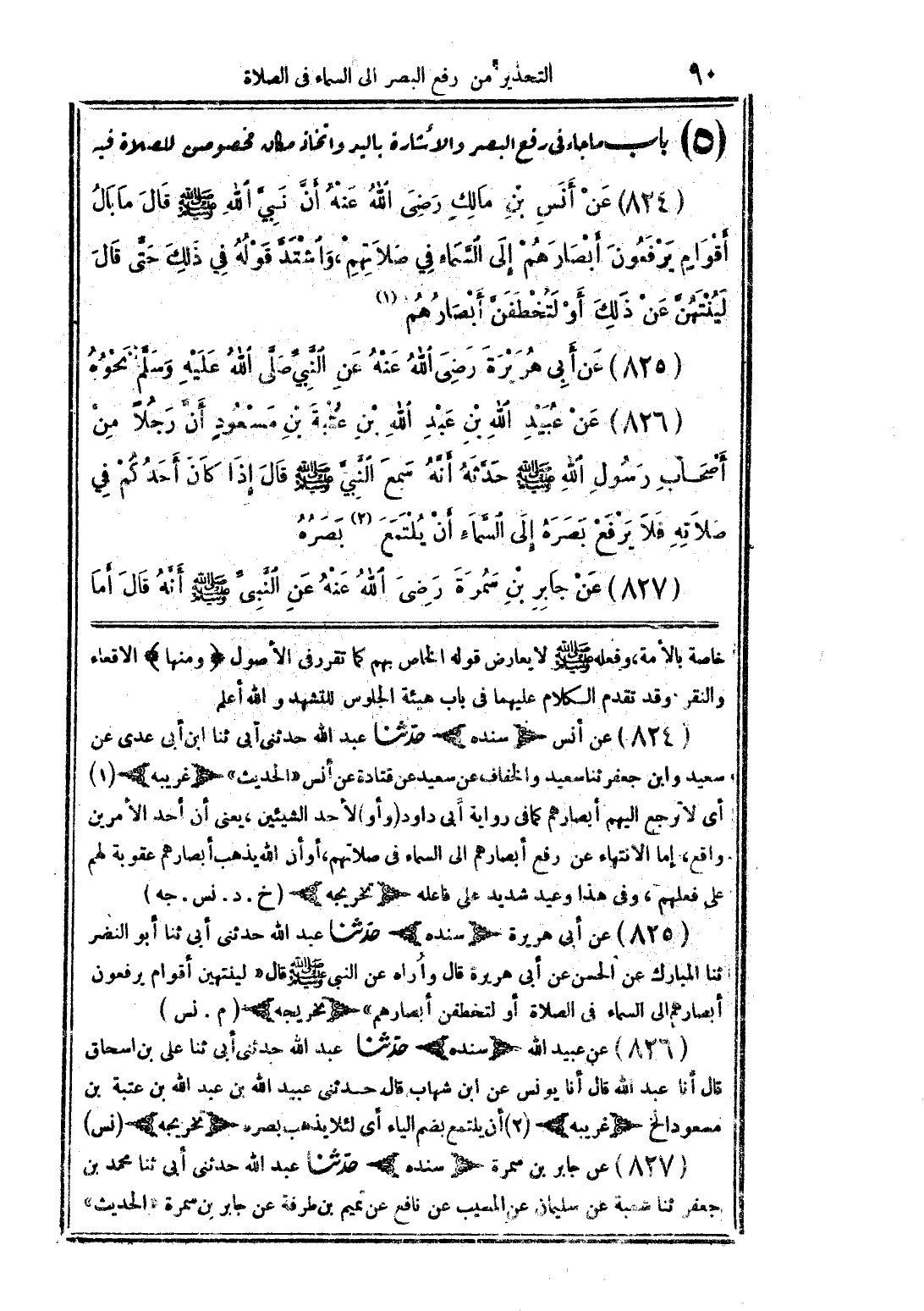 5 - باب ما جاء في رفع البصر والإشارة باليد واتخاذ مكان مخصوص للصلاة فيه 824 - عن أنس بن مالك رضي الله عنه أن نبي الله صلى الله عليه وسلم قال: ما بال أقوام يرفعون أبصارهم إلى السماء في صلاتهم، واشتد قوله في ذلك حتى قال: لينتهن عن ذلك أو لتخطفن أبصارهم (1). 825 - عن أبي هريرة رضي الله عنه عن النبي صلى الله عليه وسلم نحوه. 826 - عن عبيد الله بن عبد الله بن عتبة بن مسعود أن رجلاً من أصحاب رسول الله صلى الله عليه وسلم حدثه أنه سمع النبي صلى الله عليه وسلم قال: إذا كان أحدكم في صلاته فلا يرفع بصره إلى السماء أن يلتمع (2) بصره. 827 - عن جابر بن سمرة رضي الله عنه عن النبي صلى الله عليه وسلم أنه قال: أما