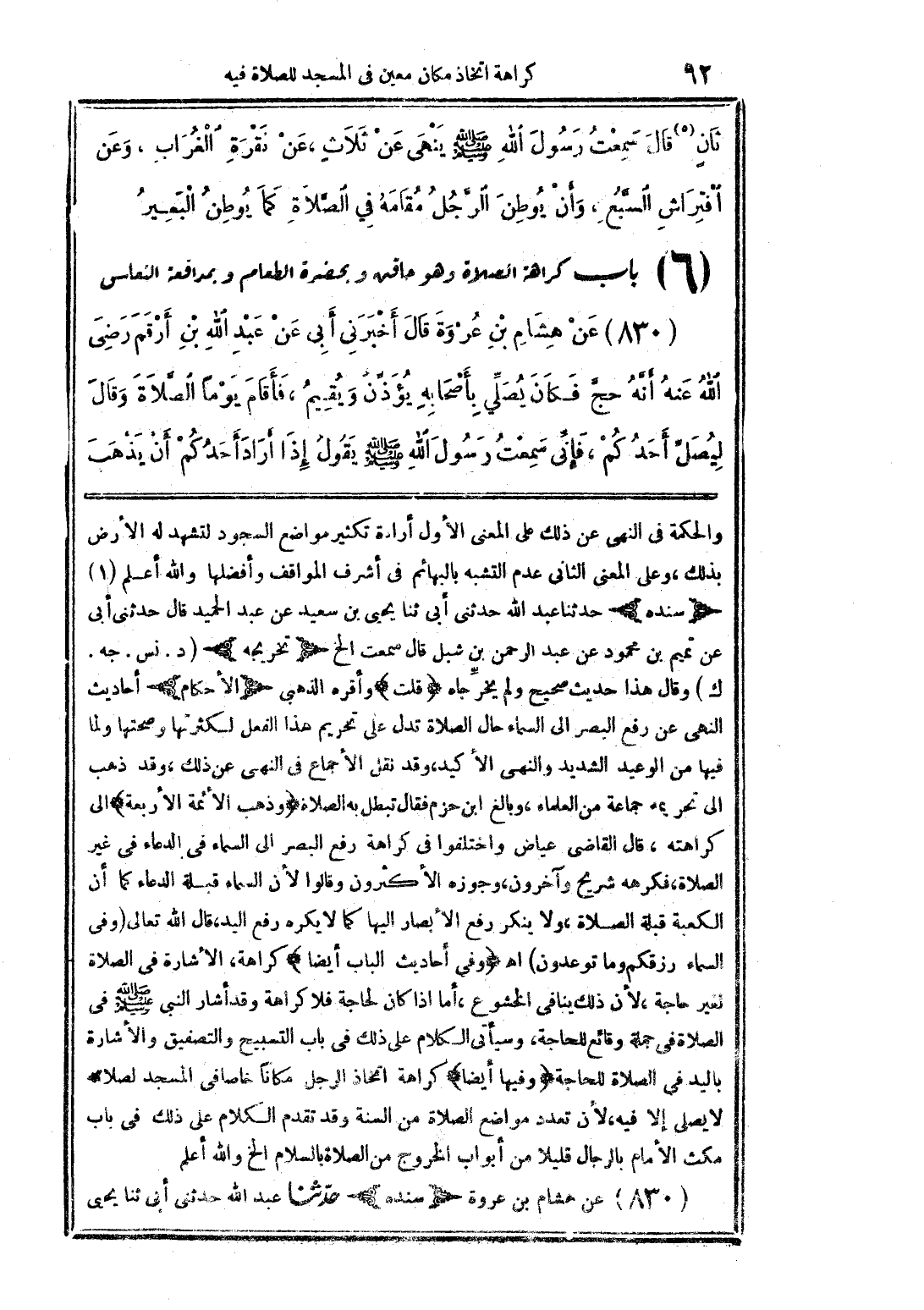 والحكمة في النهي عن ذلك على المعنى الأول إرادة تكثير مواضع السجود لتشهد له الأرض بذلك، وعلى المعنى الثاني عدم التشبه بالبهائم في أشرف المواقف وأفضلها، والله أعلم. (سنده) 1 - حدثنا عبد الله حدثني أبي ثنا يحيى بن سعيد عن عبد الحميد قال: حدثني أبي عن تميم بن محمود عن عبد الرحمن بن شبل قال: سمعت الخ. (تخريجه) (د. نس. جه. ك) وقال: هذا حديث صحيح ولم يخرجاه. قلت: وأقره الذهبي. (الأحكام) أحاديث النهي عن رفع البصر إلى السماء حال الصلاة تدل على تحريم هذا الفعل لكثرتها وصحتها ولما فيها من الوعيد الشديد والنهي الأكيد، وقد نقل الإجماع في النهي عن ذلك، وقد ذهب إلى تحريمه جماعة من العلماء، وبالغ ابن حزم فقال: تبطل به الصلاة. وذهب الأئمة الأربعة إلى كراهته، قال القاضي عياض: واختلفوا في كراهة رفع البصر إلى السماء في الدعاء في غير الصلاة، فكرهه شريح وآخرون، وجوزه الأكثرون، وقالوا: لأن السماء قبلة الدعاء كما أن الكعبة قبلة الصلاة، ولا ينكر رفع الأبصار إليها كما لا يكره رفع اليد، قال الله تعالى: {وَفِي السَّمَاءِ رِزْقُكُمْ وَمَا تُوعَدُونَ} [الذاريات/22] اهـ. وفي أحاديث الباب أيضًا كراهة الإشارة في الصلاة لغير حاجة، لأن ذلك ينافي الخشوع، أما إذا كان لحاجة فلا كراهة وقد أشار النبي صلى الله عليه وسلم في الصلاة في جملة وقائع للحاجة، وسيأتي الكلام على ذلك في باب التسبيح والتصفيق والإشارة باليد في الصلاة للحاجة. وفيها أيضًا كراهة اتخاذ الرجل مكانًا خاصًا في المسجد لصلاته لا يصلي إلا فيه، لأن تعدد مواضع الصلاة من السنة، وقد تقدم الكلام على ذلك في باب مكث الإمام بالرجال قليلاً من أبواب الخروج من الصلاة بالسلام الخ. والله أعلم. 830 - عن هشام بن عروة (سنده) حدثنا عبد الله حدثني أبي ثنا يحيى