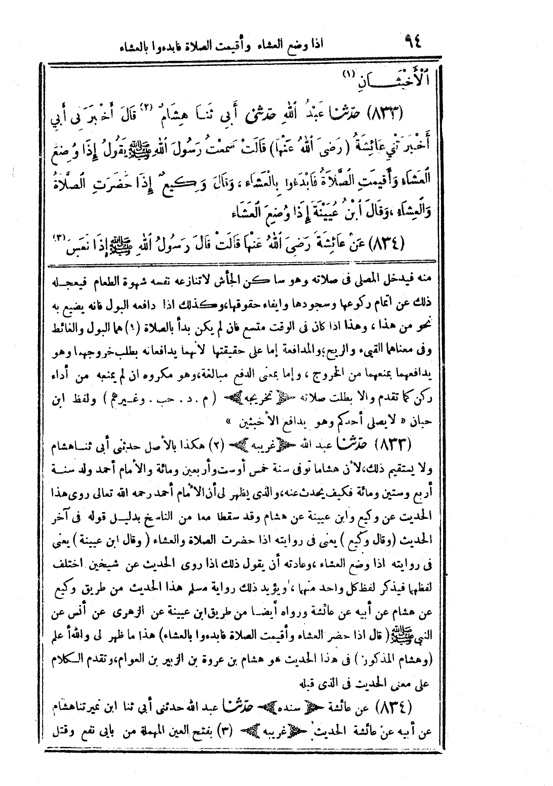 الأخبثان (1). 833 - حدثنا عبد الله حدثني أبي ثنا هشام (2) قال: أخبرني أبي أخبرتني عائشة (رضي الله عنها) قالت: سمعت رسول الله صلى الله عليه وسلم يقول: إذا وضع العشاء وأقيمت الصلاة فابدءوا بالعشاء، وقال وكيف إذا حضرت الصلاة والعشاء. وقال ابن عيينة: إذا وضع العشاء. 834 - عن عائشة رضي الله عنها قالت: قال رسول الله صلى الله عليه وسلم إذا نعس (3)