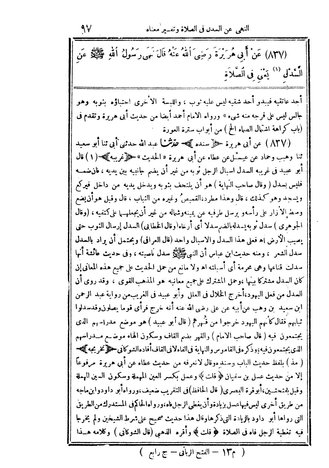 أحد عاتقيه فيبدو أحد شقيه ليس عليه ثوب، واللبسة الأخرى احتباؤه بثوبه وهو جالس ليس على فرجه منه شيء» ورواه الإمام أحمد أيضًا من حديث أبي هريرة وتقدم في باب كراهة اشتمال الصماء الخ من أبواب سترة العورة. 837 - عن أبي هريرة (سنده) حدثنا عبد الله حدثني أبي ثنا أبو سعيد ثنا وهيب وحماد عن عِسْل عن عطاء عن أبي هريرة (الحديث). (غريبه) 1 - قال أبو عبيد في غريبه: السدل إسبال الرجل ثوبه من غير أن يضم جانبيه بين يديه، فإن ضمه فليس بسدل. وقال صاحب (النهاية): هو أن يلتحف بثوبه ويدخل يديه من داخل فيركع ويسجد وهو كذلك. قال: وهذا مطرد، القميص وغيره من الثياب. قال: وقيل: هو أن يضع وسط الإزار على رأسه ويرسل طرفيه عن يمينه وشماله من غير أن يجعلهما على كتفيه. وقال الجوهري: سدل ثوبه يسدله بالضم سدلاً أي أرخاه. وقال الخطابي: السدل إرسال الثوب حتى يصيب الأرض. اهـ. فعلى هذا السدل والإسبال واحد. قال العراقي: ويحتمل أن يراد بالسدل سدل الشعر، ومنه حديث ابن عباس أن النبي صلى الله عليه وسلم سدل ناصيته، وفي حديث عائشة أنها سدلت قناعها وهي محرمة أي أسبلته. اهـ. ولا مانع من حمل الحديث على جميع هذه المعاني إن كان السدل مشتركًا بينها، وحمل المشترك على جميع معانيه هو المذهب القوي، وقد روى أن السدل من فعل اليهود، أخرج الخلال في (العلل) وأبو عبيد في (الغريب) من رواية عبد الرحمن بن سعيد بن وهب عن أبيه عن علي رضي الله عنه أنه خرج فرأى قومًا يصلون وقد سدلوا ثيابهم فقال: كأنهم اليهود خرجوا من قهرهم. قال أبو عبيد: هو موضع مدراسهم الذي يجتمعون فيه. قال صاحب (الإمام): والقهر بضم القاف وسكون الهاء موضع مدراسهم الذي يجتمعون فيه، وذكره في (القاموس) و (النهاية) في الفاء لا في القاف. أفاده الشوكاني. (تخريجه) (مذ) بلفظ حديث الباب وسنده وقال: لا نعرفه من حديث عطاء عن أبي هريرة مرفوعًا إلا من حديث عسل بن سفيان. قلت: وعسل بكسر العين المهملة وسكون السين المهملة وقيل بفتحتين، أبو قرة البصري. قال الحافظ في (التقريب): ضعيف، ورواه أبو داود وابن ماجه من طريق أخرى ليس فيها عسل بزيادة «وأن يغطي الرجل فاه»، ورواه الحاكم في (المستدرك) من الطريق التي رواها أبو داود بالزيادة التي ذكرها وقال: هذا حديث صحيح على شرط الشيخين ولم يخرجا فيه تغطية الرجل فاه في الصلاة. قلت: وأقره الذهبي. قال الشوكاني: وكلامه هذا