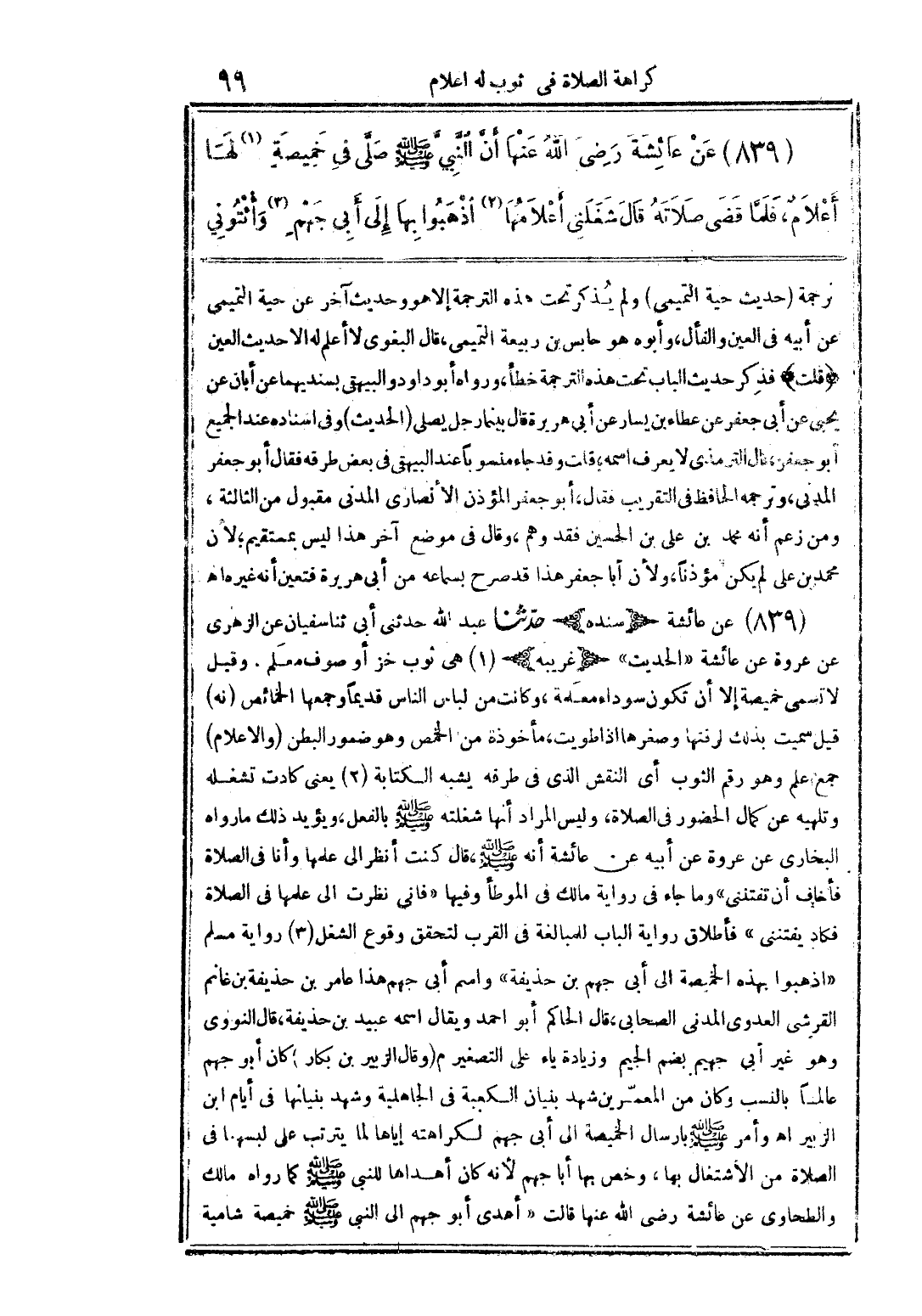 839 - عن عائشة رضي الله عنها أن النبي صلى الله عليه وسلم صلى في خميصة (1) لها أعلام، فلما قضى صلاته قال: شغلتني أعلامها (2) اذهبوا بها إلى أبي جهم (3) وائتوني