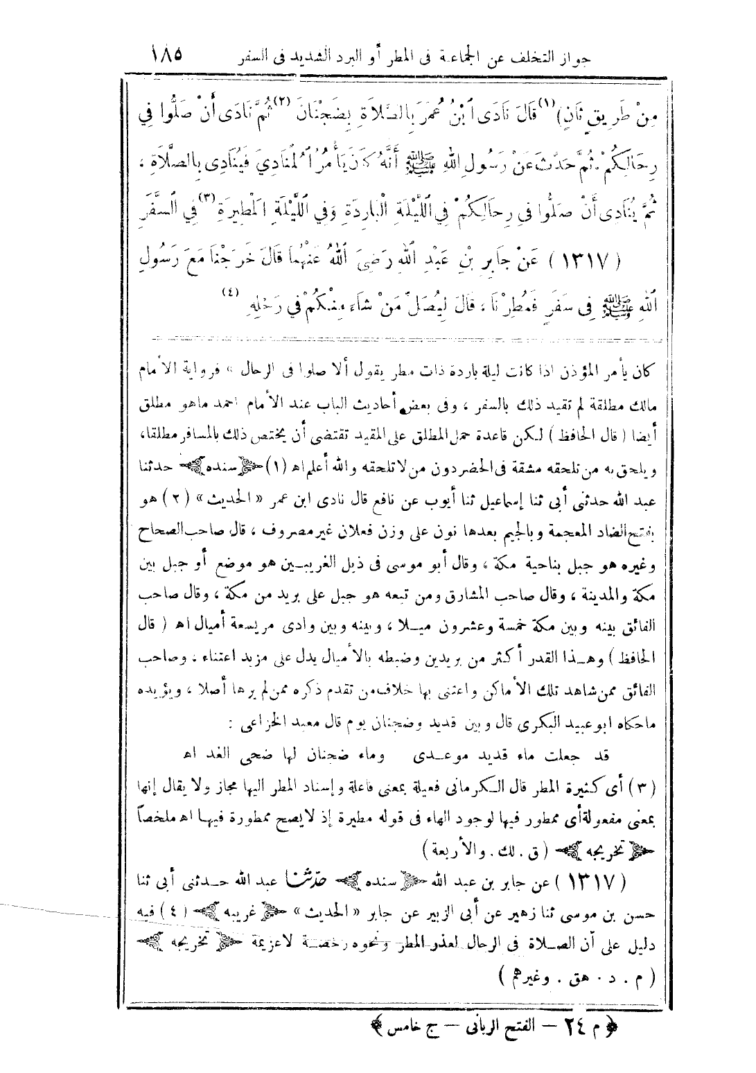 من طريق ثانٍ) قال نادى ابن عمر بالصَّلاة بضجنان ثم نادى أن صلُّوا فى رحالكم ثمَّ حدَّث عن رسول الله صلى الله عليه وسلم أنَّه كان يأمر المنادي فينادي بالصلَّاة، ثمَّ ينادى أن صلُّوا فى رحالكم في اللَّيلة الباردة وفي اللَّيلة المطيرة في السفَّر