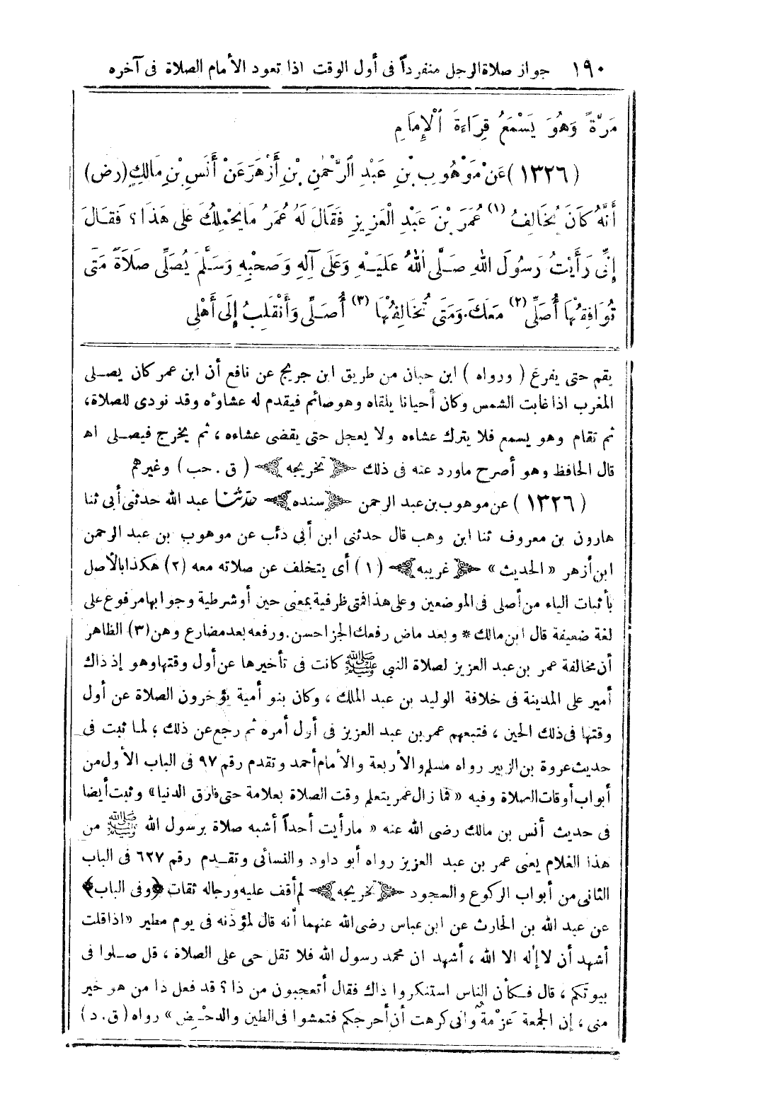 عن موهوب بن عبد الرَّحمن بن أزهر عن أنس بن مالك (رض) أنَّه كان يخالف عمر بن عبد العزيز فقال له عمر ما يحملك على هذا؟ فقال إنَّى رأيت رسول الله صلَّى الله عليه وسلم وعلى آله وصحبه وسلَّم يصلَّى صلاةً متى توافقها أصلِّى معك. ومتى تخالفها أصلِّى وأنقلب إلى أهلي