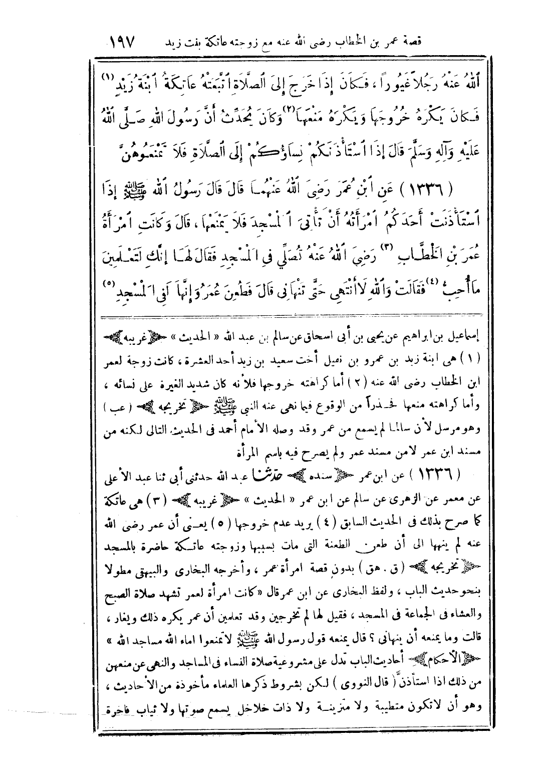 عن ابن عمر رضى الله عنهما قال قال رسول الله صلى الله عليه وسلم إذا استأذنت أحدكم امرأته أن تأتى المسجد فلا يمنعها، قال وكانت امرأة عمر بن الخطّاب رضى الله عنه تصلِّي فى المسجد فقال لها إنَّك لتعلمهين ما أحب فقالت والله لا أنتهى حتَّى تنها قال فطعن عمرو إنَّها لفي المسجد