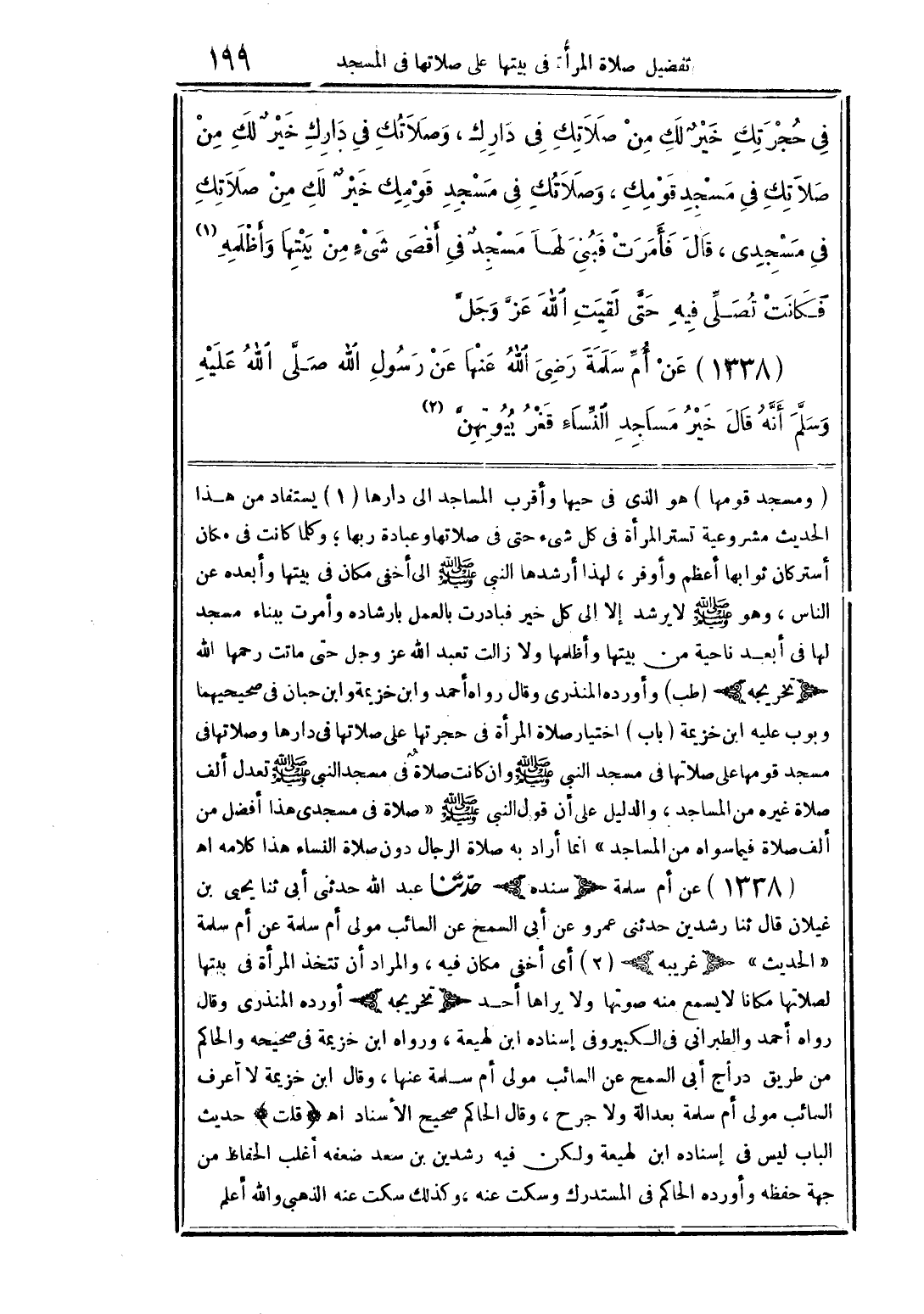 عن أمِّ سلمة رضى الله عنها عن رسول الله صلَّى الله عليه وسلَّم أنَّه خير مساجد النَّساء قغر بيوتهنَّ