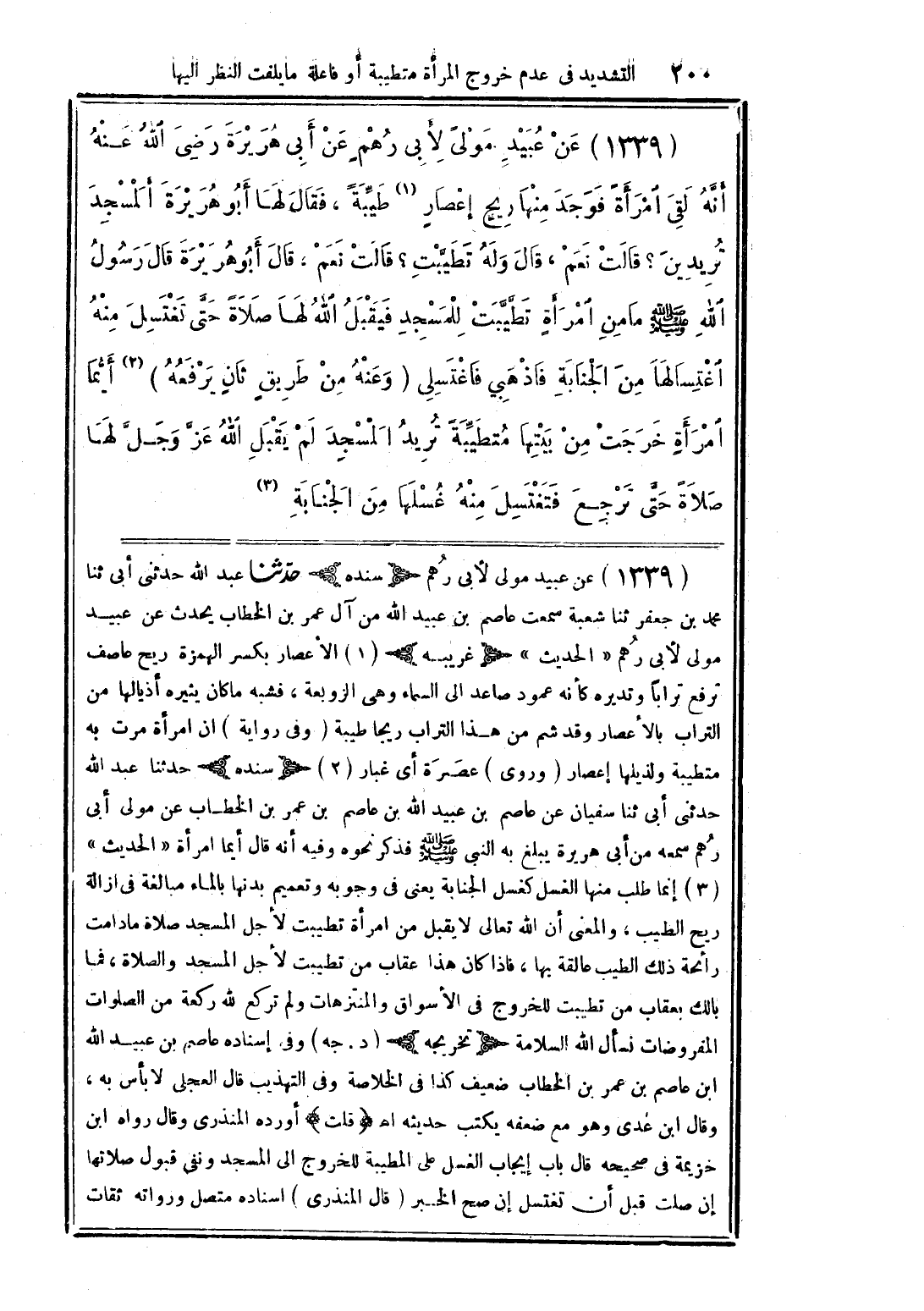 (1339) عن عبيد مولى لأبى رهمٍ عن أبى هريرة رضى الله عنه أنَّه لقى امرأةً فوجد منها ريج إعصارٍ طيِّبة، فقال لها أبو هريرة المسجد تريدينً؟ قالت نعم، قال وله تطيَّبت؟ قالت نعم، قال أبو هريرة قال رسول الله صلى الله عليه وسلم ما من امرأةٍ تطَّيَّبت للمسجد فيقبل الله لها صلاةً حتَّى تغتسل منه اغتسالها من الجنابة فاذهبي فاغتسلي (وعنه من طريقٍ ثانٍ يرفعه) أيُّما امرأةٍ خرجت من بيتها متطيَّبةً تريد المسجد لم يقبل الله عزَّ وجلَّ لها صلاةً حتَّى ترجع فتغتسل منه غسلها من الجنابة