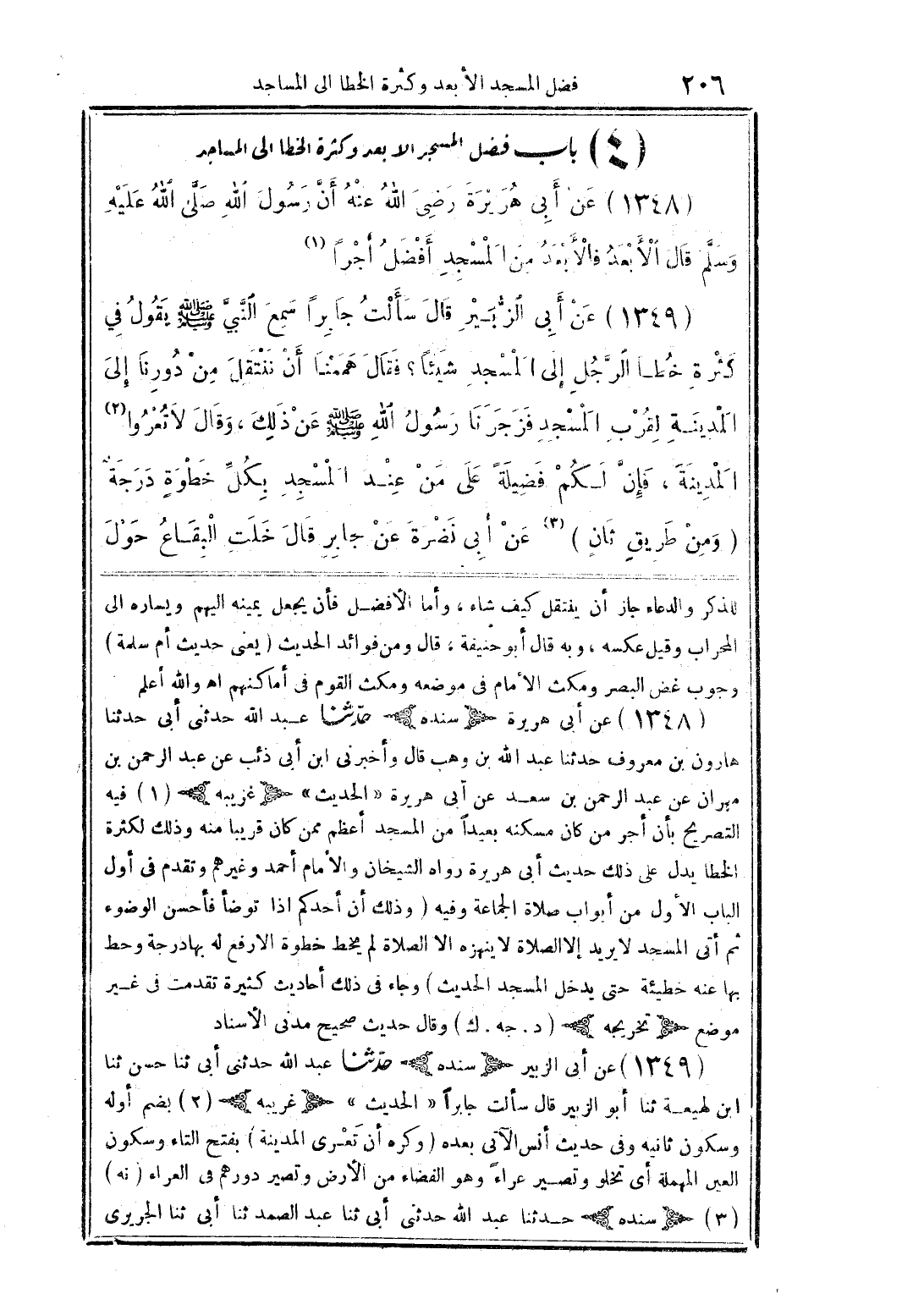 عن أبى الزُّبير قال سألت جابرًا سميع النَّبيَّ صلى الله عليه وسلم يقول في كثرة خطا الرَّجل إلى المسجد شيئًا؟ فقال هممنا أن ننتقل من دورنا إلى المدينة لقرب المسجد فزجرنا رسول الله صلى الله عليه وسلم عن ذلك، وقال لا تعروا المدينة، فإنَّ لكم فضيلةً على من عند المسجد بكلِّ خطوةٍ درجة (ومن طريقٍ ثانٍ) عن أبى نضرة عن جابر قال خلت البقاع حول