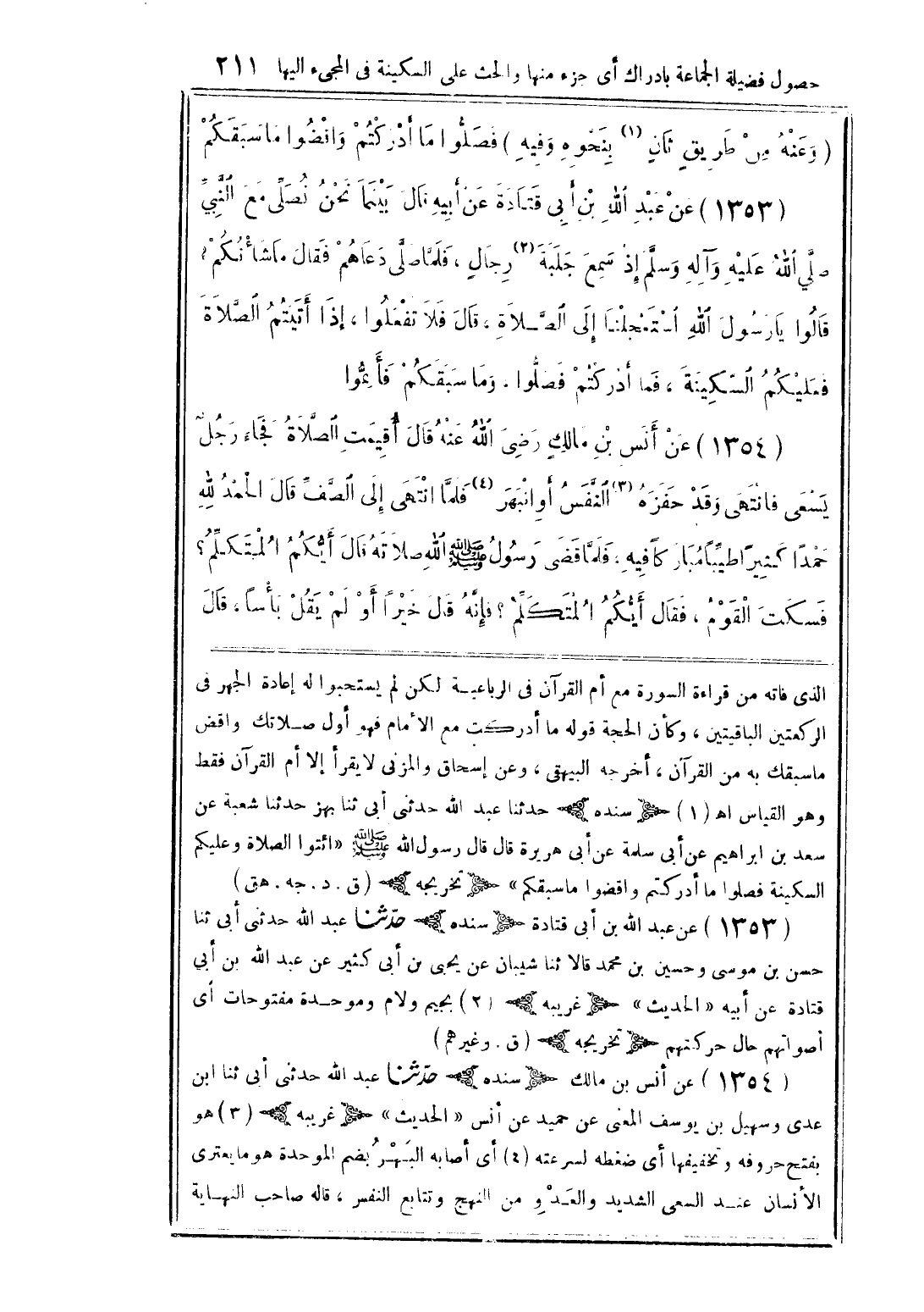 (1353) عن عبد الله بن أبى قتادة عن أبيه قال بينما نحن نصلَّى مع النَّبى صلَّى الله عليه وآله وسلَّم إذا سمع جلبة رجالٍ، فلمَّا صلَّى دعاهم فقال ما شأنكم قالوا يا رسول الله استعجلنا إلى الصَّلاة، قال فلا تفعلوا، إذا أتيتم الصَّلاة فعليكم السّكينة، فما أذركتم فصلّوا. وما سبقكم فأتُّموا