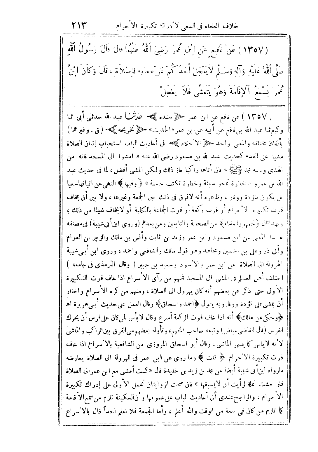 (1357) عن نافع عن ابن عمر (سنده) حدثنا عبد الله حدثني أبي ثنا وكيع ثنا عبد الله بن نافع عن أبيه عن ابن عمر "الحديث" (تخريجه) (ق. وغيرهما) بألفاظ مختلفة والمعنى واحد (الأحكام) في أحاديث الباب استحباب إتيان الصلاة مشيًا على القدم كحديث عبد الله بن مسعود رضي الله عنه "امشوا إلى المسجد فإنه من الهدي وسنة محمد صلى الله عليه وسلم " فإن أتاها راكبًا جاز ذلك ولكن المشي أفضل، لما في حديث عبد الله بن عمرو "خطوة تمحو سيئة وخطوة تكتب حسنة" (وفيها) النهي عن إتيانها سعيًا بل يكون بتؤدة ووقار، وظاهره أنه لا فرق في ذلك بين الجمعة وغيرها، ولا بين أن يخاف فوت تكبيرة الإحرام أو فوت ركعة أو فوت الجماعة بالكلية أو لا يخاف شيئًا من ذلك؛ وبهذا قال (جمهور العلماء) من الصحابة والتابعين ومن بعدهم (وروى ابن أبي شيبة) في مصنفه هذا المعنى عن ابن مسعود وابن عمر وزيد بن ثابت وأنس بن مالك والزبير بن العوام وأبي در وعلي بن الحسين ومجاهد وهو قول مالك والشافعي وأحمد، وروى ابن أبي شيبة الهرولة إلى الصلاة عن ابن عمر والأسود وسعيد بن جبير (وقال الترمذي في جامعه) اختلف أهل العلم في المشي إلى المسجد فمنهم من رآى الاسراع إذا خاف فوت التكبيرة الأولى حتى ذكر عن بعضهم أنه كان يهرول إلى الصلاة، ومنهم من كره الاسراع واختار أن يمشي على تؤدة ووقار وبه يقول (أحمد واسحاق) وقال العمل على حديث أبي هريرة اهـ (وحكى عن مالك) أنه إذا خاف فوت الركعة أسرع وقال لا بأس لمن كان على فرس أن يحرك الفرس (قال القاضي عياض) وتبعه صاحب المفهم، وتأوله بعضهم على الفرق بين الراكب والماشي لأنه لا ينبهر كما ينبهر الماشي، وقال أبو اسحاق الروزي من الشافعية بالاسراع إذا خاف فوت تكبيرة الاحرام (قلت) وما روي عن ابن عمر في الهرولة إلى الصلاة يعارضه ما رواه ابن أبي شيبة أيضًا عن محمد بن زيد بن خليدة قال "كنت أمشي مع ابن عمر إلى الصلاة فلو مشت نملة لرأيت أن لا يسبقها" فإن صحت الروايتان تحمل الأولى على إدارك تكبيرة الاحرام، والراجح عندي أن أحاديث الباب على عمومها وأن السكينة تلزم من سمع الإقامة كما تلزم كم كان في سعة من الوقت والله أعلم، وأما الجمعة فلا نعلم أحدًا قال بالإسراع
