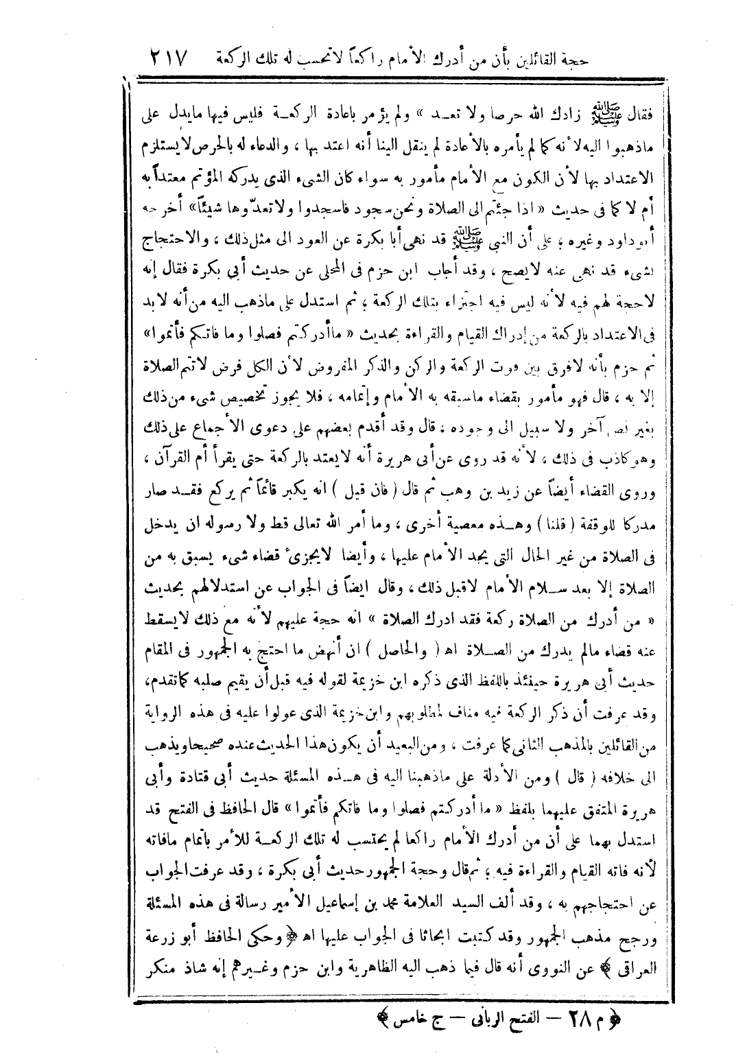 فقال صلى الله عليه وسلم زادك الله حرصًا ولا تعد" ولم يؤمر بإعادة الركعة فليس فيها ما يدل على ما ذهبوا إليه لأنه كما لم يأمره بالإعادة لم ينقل إلينا أنه اعتد بها، والدعاء له بالحرص لا يستلزم الاعتداد بها لأن الكون مع الإمام مأمور به سواء كان الشيء الذي يدركه المؤتم معتمدًا به أم لا كما في حديث "إذا جئتم إلى الصلاة ونحن سجود فاسجدوا ولا تعدّوها شيئًا" أخرجه أبو داود وغيره؛ على أن النبي صلى الله عليه وسلم قد نهى أبا بكرة عن العود إلى مثل ذلك، والاحتجاج بشيء قد نهى عنه لا يصح، وقد أجاب ابن حزم في المحلى عن حديث أبي بكرة فقال إنه لا حجة لهم فيه لأنه ليس فيه اجتزاء بتلك الركعة؛ ثم استدل على ما ذهب إليه من أنه لا بد في الاعتداد بالركعة من إدراك القيام والقراءة بحديث "ما أدركتم فصلوا وما فاتكم فأتموا" ثم حزم بأنه لا فرق بين فوت الركعة والركن والذكر المفروض لأن الكل فرض لا تتم الصلاة إلا به، قال فهو مأمور بقضاء ما سبقه به الإمام وإتمامه، فلا يجوز تخصيص شيء من ذلك بغير نص آخر ولا سبيل إلى وجوده، قال وقد أقدم بعضهم على دعوى الإجماع على ذلك وهو كاذب في ذلك، لأنه قد روى عن أبي هريرة أنه لا يعتد بالركعة حتى يقرأ أم القرآن، وروى القضاء أيضًا عن زيد بن وهب ثم قال (فإن قيل) أنه يكبر قائمًا ثم يركع فقد صار مدركًا للوقفة (قلنا) وهذه معصية أخرى، وما أمر الله تعالى قط ولا رسوله أن يدخل في الصلاة من غير الحال التي يجد الإمام عليها، وأيضًا لا يجزئ قضاء شيء يسبق به من الصلاة إلا بعد سلام الإمام لا قبل ذلك، وقال أيضًا في الجواب عن استدلالهم بحديث "من أدرك من الصلاة ركعة فقد أدرك الصلاة" أنه حجة عليهم لأنه مع ذلك لا يسقط عنه قضاء ما لم يدرك من الصلاة اهـ (والحاصل) أن أنهض ما احتج به الجمهور في المقام حديث أبي هريرة حينئذ باللفظ الذي ذكره ابن خزيمة لقوله فيه قبل أن يقيم صلبه كما تقدم، وقد عرفت أن ذكر الركعة فيه مناف لمطلوبهم وابن خزيمة الذي عولوا عليه في هذه الرواية من القائلين بالمذهب الثاني كما عرفت، ومن البعيد أن يكون هذا الحديث عنده صحيحًا ويذهب إلى خلافه (قال) ومن الأدلة على ما ذهبنا إليه في هذه المسءلة حديث أبي قتادة وأبي هريرة عليهما بلفظ "ما أدركتم فصلوا وما فاتكم فأتموا" قال الحافظ في الفتح قد استدل بهما على أن من أدرك الإمام راكعًا لم يحتسب له تلك الركعة للأمر بإتمام ما فاته لأنه فاته القيام والقراءة فيه؛ ثم قال وحجة الجمهور وحديث أبي بكرة، وقد عرفت الجواب عن احتجاجهم به، وقد ألف السيد العلامة محمد بن إسماعيل الأمير رسالة في هذه المسئلة ورجح مذهب الجمهور وقد كتبت أبحاثًا في الجواب عليها اهـ (وحكى الحافظ أبو زرعة العراقي) عن النووي أنه قال فيما ذهب إليه الظاهرية وابن حزم وغيرهم إنه شاذ منكر