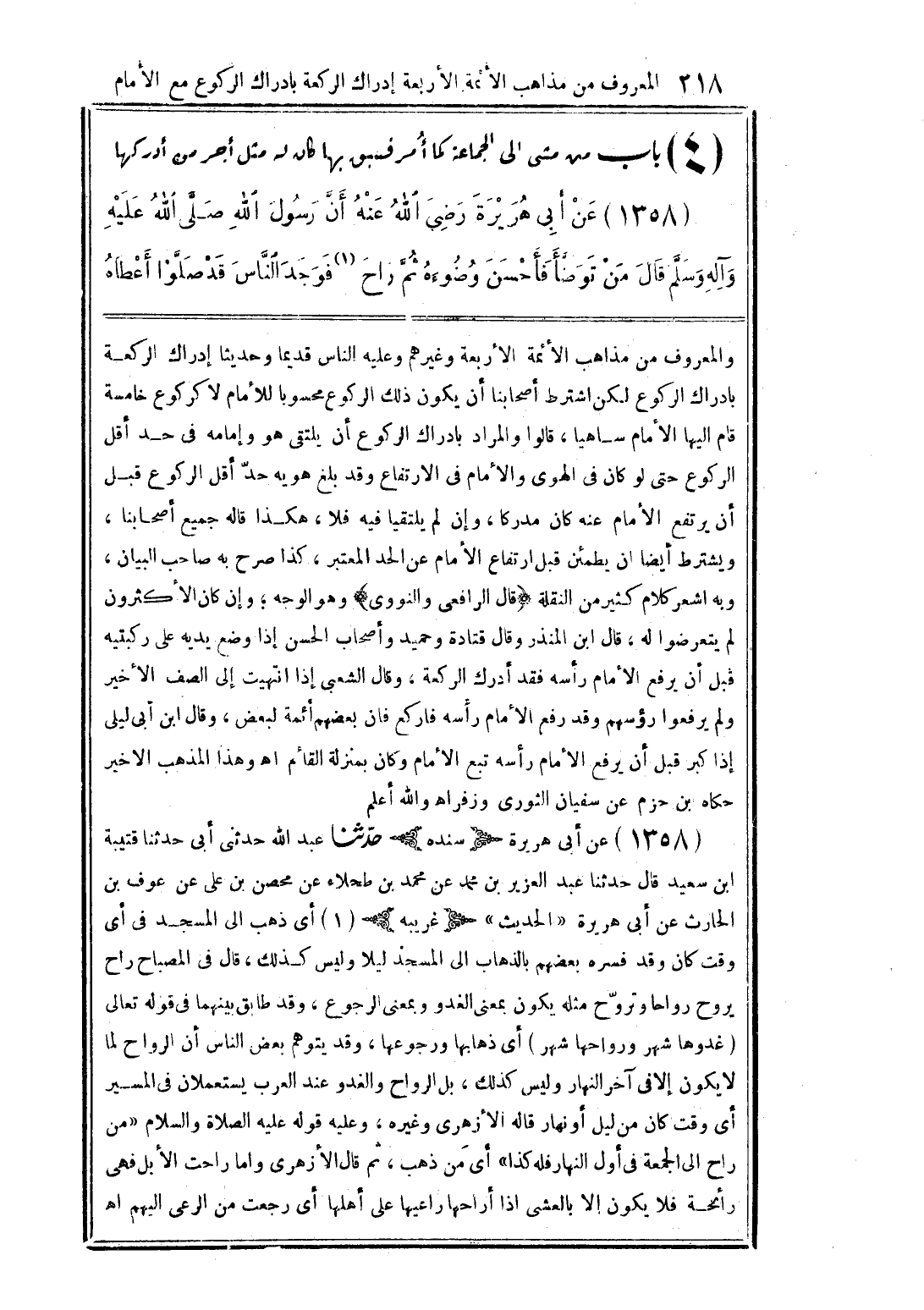 (1358) عن أبى هريرة رضى الله عنه أنَّ رسول الله صلَّى الله عليه وآله وسلَّم قال من توضَّأ فأحسن وضوءه ثمَّ راح فوجد النَّاس قد صلَّوا أعطاه