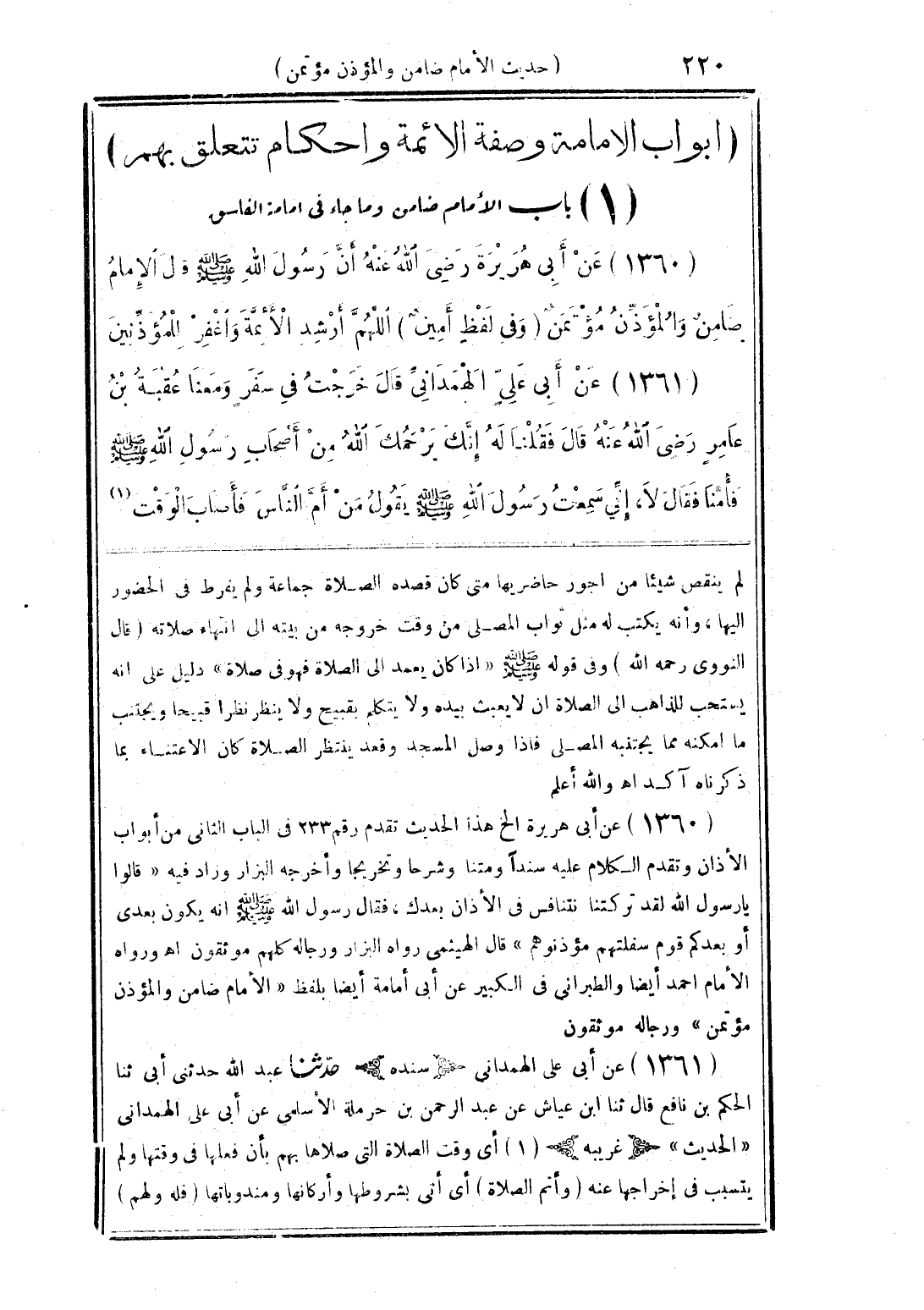 (1361) عن أبى علىّ الهمدانهىِّ قال خرجت فى سفرٍ ومعنا عقبة بن عامرٍ رضى الله عنه قال فقلنا إنَّك يرحمك الله من أصحاب رسول الله صلى الله عله وسلم فأمَّنا فقال لا، إنَّي سمعت رسول الله صلى الله عليه وسلم يقول من أم النَّاس فأصاب الوقت