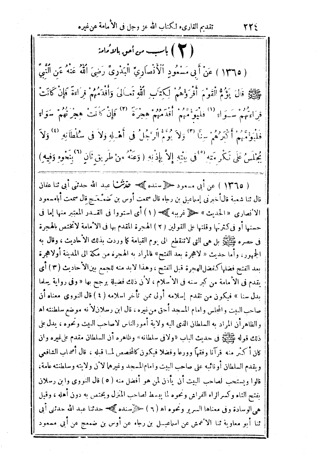 (1365) عن أبى مسعودٍ الأنصاريِّ البدرىِّ رضى الله عنه عن النَّبيِّ صلى الله عليه وسلم قال يومُّ القوم أقرؤهم لكتب الله تعالى وأقدمهم قراءةً فإن كانت قراءتهم سواءً فليؤمَّهم أقدمهم هجرةً فإت كانت هجرتهم سواءً فليؤمَّهم أكبرهم سنًّا ولا يؤمُّ الرَّجل فى أهله ولا فى سلطانه ولا يجلس على تكرمته فى بيته إلاَّ بإذنه (وعنه من طريقٍ ثانٍ بنحوه وفيه)