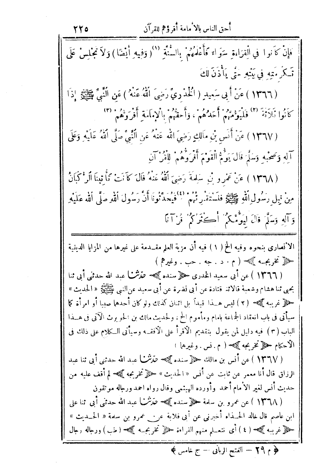 (1367) عن أنس بن مالكٍ رضي الله عنه النَّبيِّ صلَّى الله عليه وعلى آله وصحبه وسلَّم قال يؤمُّ القوم أقرؤهم للقرآن