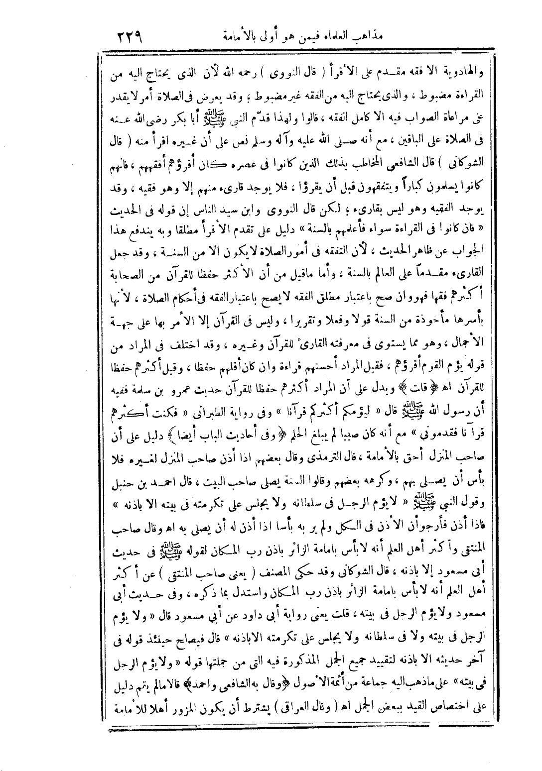 والهادوية الأفقه مقدم على الأقرأ (قال النووي) رحمه الله لأن الذي يحتاج إليه من القراءة مضبوط، والذي يحتاج إليه من الفقه غير مضبوط؛ وقد يعرض في الصلاة أمر لا يقدر على مراعاة الصواب فيه إلاكامل الفقه، قالوا ولهذا قدّم النبي صلى الله عليه وسلم أبا بكر رضي الله عنه في الصلاة على الباقين، مع أنه صلى الله عليه وآله وسلم نص على أن غيره اقرأ منه (قال الشوكاني) قال الشافعي المخاطب بذلك الذين كانوا في عصره كان أقرؤهم أفقههم، فإنهم كانوا يسلمون كبارًا ويتفقهون قبل أن يقرؤا، فلا يوجد قارئ منهم إلا وهو فقيه، وقد يوجد الفقيه وهو ليس بقارئ؛ لكن قال النووي وابن سيد الناس إن قوله في الحديث "فإن كانوا في القراءة سواء فأعلمهم بالسنة" دليل على تقدم الأقرأ مطلقا وبه يندفع هذا الجواب عن ظاهر الحديث، لأن التفقه في أمور الصلاة لا يكون إلا من السنة، وقد جعل القارئ مقدما على العالم بالسنة، وأما ما قيل من أن الأكثر حفظًا للقرآن من الصحابة أكثرهم فقها فهو وإن صح باعتبار مطلق الفقه لا يصح باعتبار الفقه في أحكام الصلاة، لأنها بأسرها مأخوذة من السنة قولا وفعلا وتقريرا، وليس في القرآن إلا الأمر بها على جهة الأجمال، وهو ما يستوي في معرفته القارئ للقرآن وغيره، وقد اختلف في المراد من قوله يؤم القوم أقرؤهم، فقيل المراد أحسنهم قراءة وإن كان أقلهم حفظا، وقبل أكثرهم حفظا للقرآن اهـ (قلت) ويدل على أن المراد أكثرهم حفظا للقرآن حديث عمرو بن سلمة ففيه أن رسول الله صلى الله عليه وسلم قلا "ليؤمكم أكثركم قرآنا" وفي رواية الطبراني "فكنت أكثرهم قرآنا فقدموني" مع أنه كان صبيا لم يبلغ الحلم (وفي أحاديث الباب أيضا) دليل على أن صاحب المنزل أحق بالأمامة، قال الترمذي وقال بعضهم إذ أذن صاحب المنزل لغيره فلا بأس أن يصلي بهم، وكرهه بعضهم وقالوا السنة يصلي صاحب البيت، قال أحمد بن حنبل وقول النبي صلى الله عليه وسلم "لا يؤم الرجل في سلطانه ولا يجلس على تكرمته في بيته إلا بإذنه" فإذا أذن فأرجو أن الأذن في الكل ولم ير به بأسا إذا أذن له أن يصلي به اهـ وقال صاحب المنتقي وأكثر أهل العلم أنه لا بأس بإمامة الزائر بإذن رب المكان لقوله صلى الله عليه وسلم في حديث أبي مسعود إلا بإذنه، قال الشوكاني وقد حكى المصنف (يعني صاحب المنتقى) عن أكثر أهل العلم أنه لا بأس بإمامة الزائر بإذن رب المكان واستدل بما ذكره، وفي حديث أبي مسعود ولا يؤم الرجل في بيته، قلت يعني رواية أبي داود عن أبي مسعود قال "ولا يؤم الرجل في بيته ولا في سلطانه ولا يجلس على تكرمته إلا بإذنه" قال فيصلح حينئذ قوله في آخر حديثه إلا بإذنه لتقييد جميع الجمل المذكورة فيه التي من جملتها قوله "ولا يؤم الرجل في بيته" على ما ذهب إليه جماعة من أئمة الأصول (وقال به الشافعي وأحمد) قالا ما لم يقم دليل على اختصاص القيد ببعض الجمل اهـ (وقال العراقي) يشترط أن يكون المزور أهلا للإمامة