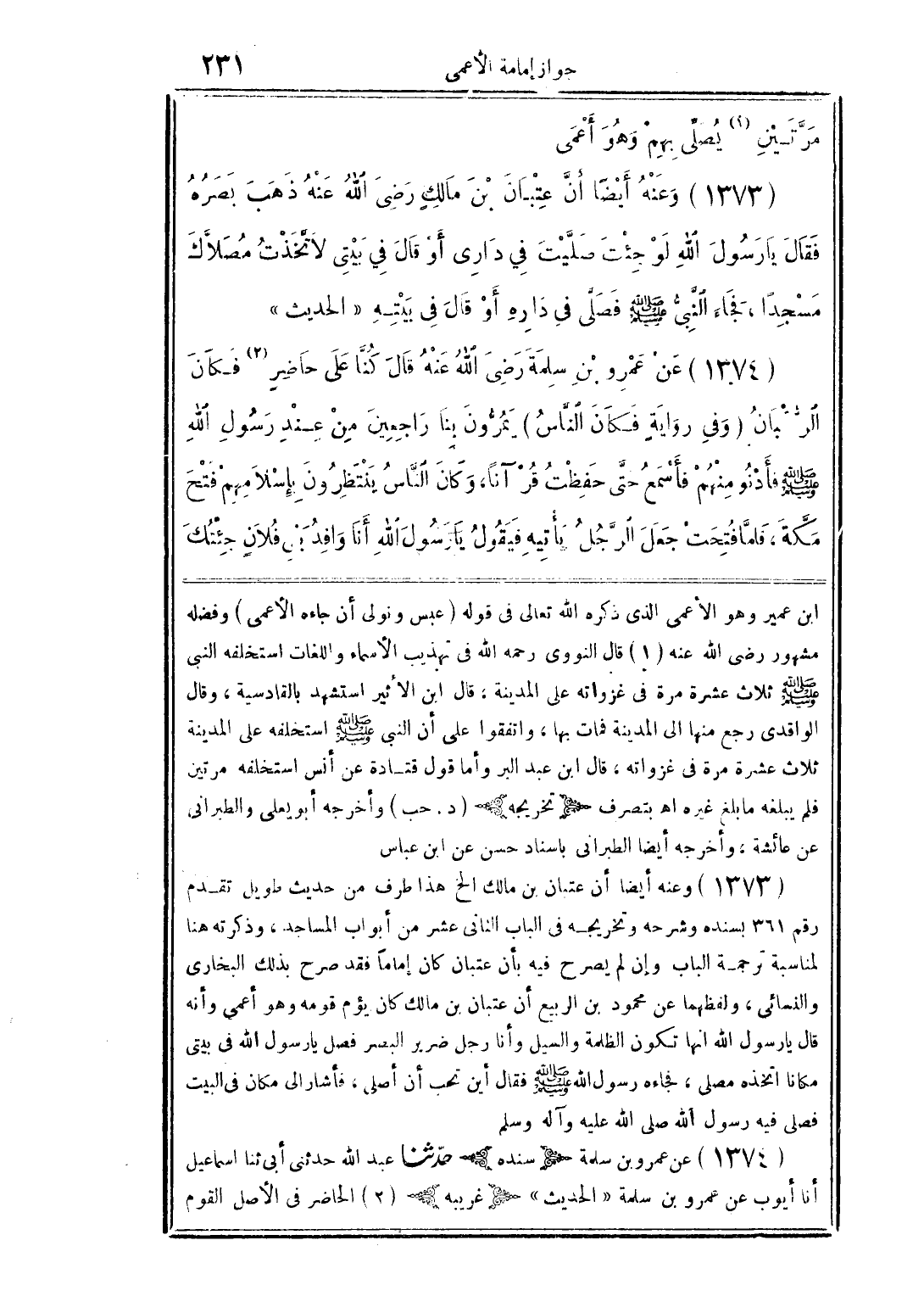 (1373) وعنه أيضا أن عتبان بن مالك إلخ هذا طرف من حديث طويل تقدم رقم 361 بسنده وشرحه وتخريجه في الباب الثاني عشر من أبواب المساجد، وذكرته هنا لمناسبة ترجمة الباب وإن لم يصرح فيه بأن عتبان كان إمامًا فقد صرح بذلك البخاري والنسائي، ولفظهما عن محمود بن الربيع أم عتبان بن مالك كان يؤم قومه وهو أعمى وأنه قال يا رسول الله إنها تكون الظلمة والسيل وأما رجل ضرير البصر فصل يا رسول الله في بيتي مكانا اتخذه مصلى، فجاءه رسول الله صلى الله عليه وسلم فقل أين تحب أن أصلي، فأشار إلى مكان في البيت فصلى فيه رسول الله صلى الله عليه وسلم.