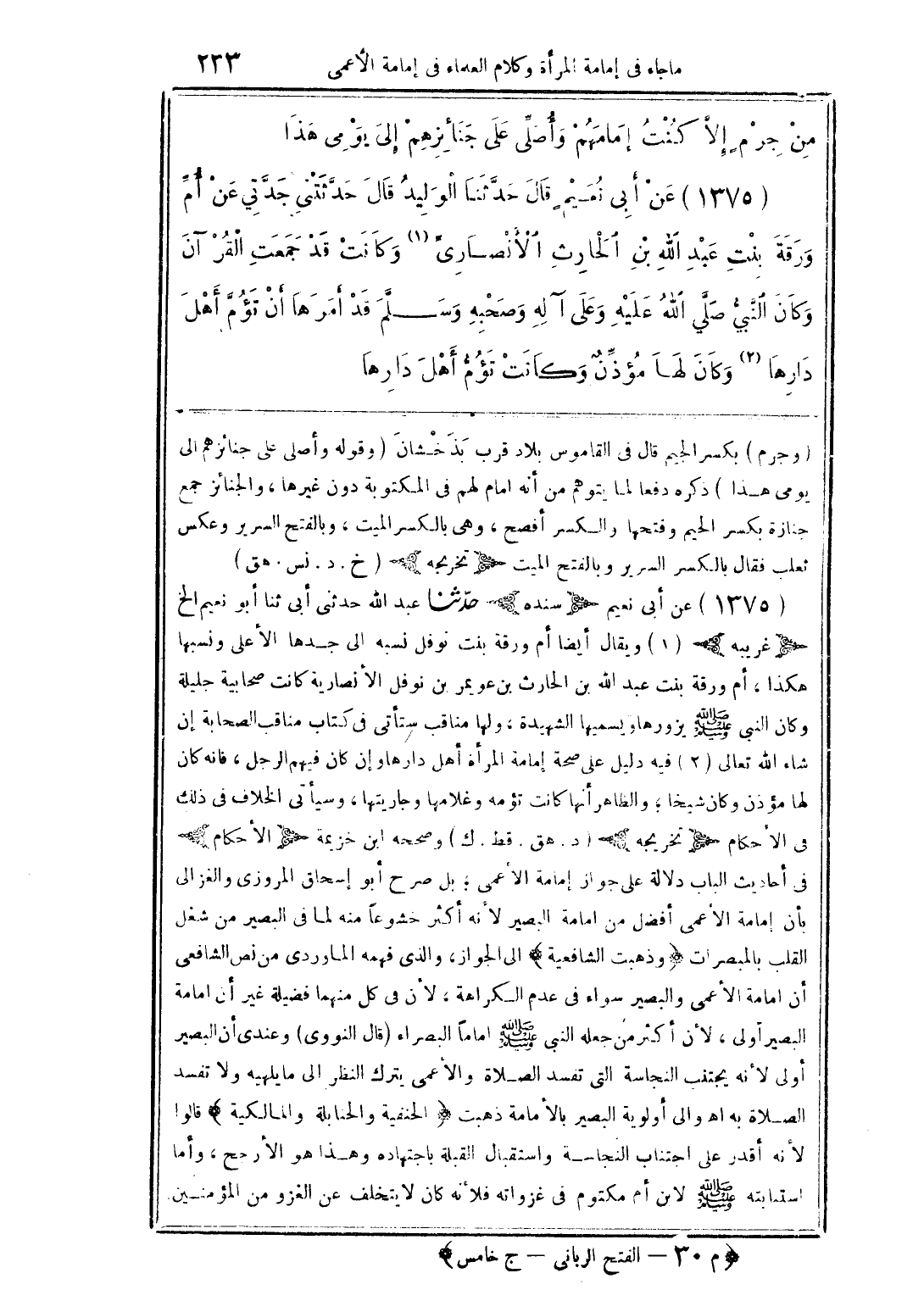 (1375) عن أبي نعيم (سنده) حدّثنا عبد الله حدثني أبي ثنا أبو نعيم الخ (غريبه) (1) ويقال أيضا أم ورقة بنت نوفل نسبه إلى جدها الأعلى ونسبها هكذا، أم ورقة بنت عبد الله بن الحارث بن عويمر بن نوفل الأنصارية كانت صحابية جليلة وكان النبي صلى الله عليه وسلم يزورها ويسميها الشهيدة، ولها مناقب ستأتي في كتاب مناقب الصحابة إن شاء الله تعالى (2) فيه دليل على صحة إمامة المرأة أهل دارها وإن كان فيهم الرجل، فإنه كان لها مؤذن وكان شيخا؛ والظاهر أنها كانت تؤمه وغلامها وجاريتها، وسيأتي الخلاف في ذلك في الأحكام (تخريجه) (د. هق. قط. ك) وصححه ابن خزيمة (الأحكام) في أحاديث الباب دلالة على جواز إمامة الأعمى؛ بل صرح أبو إسحاق المروزي والغزالي بأن إمامة الأعمى أفضل من إمامة البصير لأنه أكثر خشوعًا منه لما في البصير من شغل القلب بالمبصرات (وذهبت الشافعية) إلى الجواز، والذي فهمه الماوردي من نص الشافعي أن إمامة الأعمى والبصير سواء في عدم الكراهة؛ لأن في كل منهما فضيلة غير أن إمامة البصير أولى، لأن أكثر من جعله النبي صلى الله عليه وسلم إماما البصراء (قال النووي) وعندي أن البصير أولى لأنه يجتنب النجاسة التي تفسد الصلاة والأعمى يترك النظر إلى ما يلهيه ولا تفسد الصلاة به اهـ وإلى أولوية البصير بالأمامة ذهبت (الحنفية والحنابلة والمالكية) قالوا لأنه أقدر على اجتناب النجاسة واستقبال القبلة باجتهاده وهذا هو الأرجح، وأما استتابته صلى الله عليه وسلم لابن أم مكتوم في غزواته فلأنه كان لا يتخلف عن الغزو من المؤمنين.