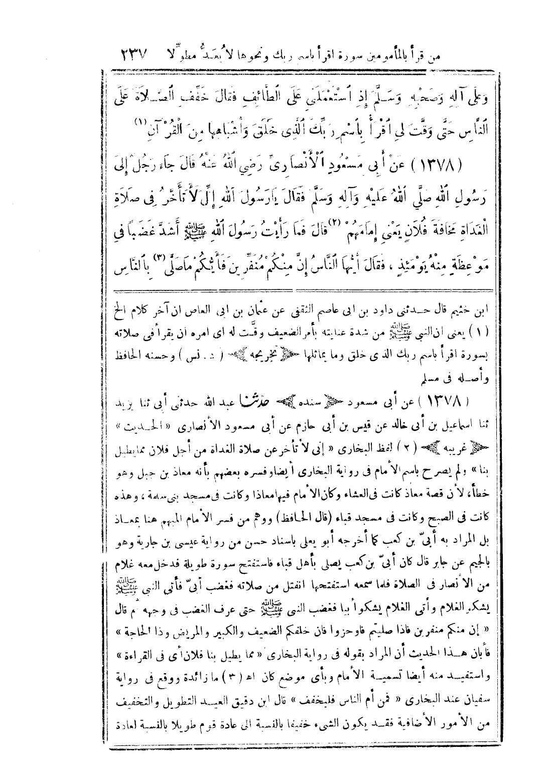 (1378) عن أبى مسعودٍ الأنصارىِّ رضي الله عنه قال جاء رجلٌ إلى رسول الله صلَّي الله عليه وآله وسلَّم فقال يا رسول الله إلَّ لا تأخَّر فى صلاة الغداة مخافة فلانٍ يعنى إمامهم (2) قال فما رأيت رسول الله صلى الله عليه وسلم أشدَّ غضبًا فى موعظة منه يومئذٍ، فقال أيها النَّاس إن منكم منفِّرين فأيكم ما صلَّى (3) بالنَّاس