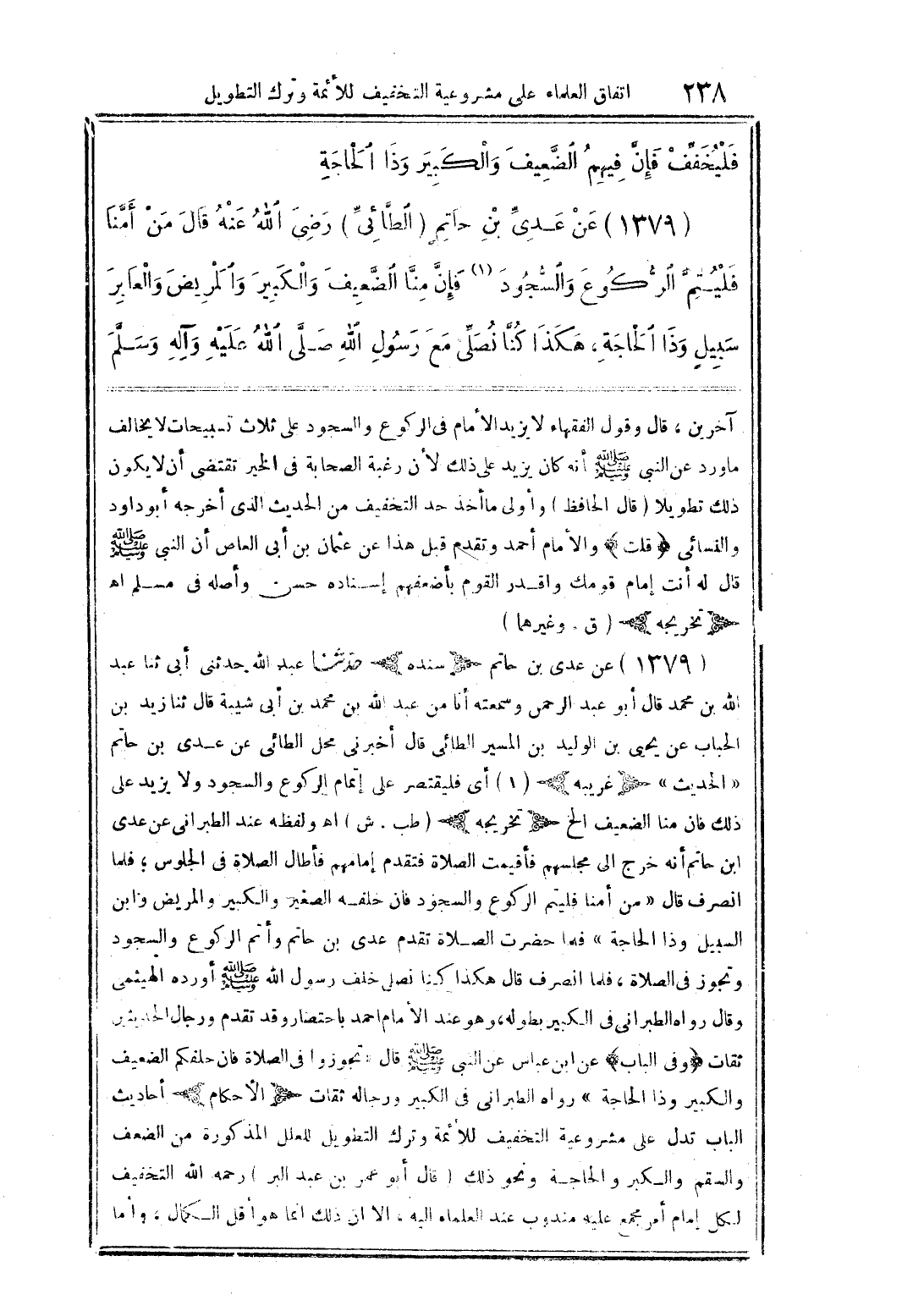 (1379) عن عدىِّ بن حاتمٍ (الطَّائىِّ) رضى الله عنه قال من أمَّنا فليتمَّ الرُّكوع والسُّجود (1) فإنَّ منَّا الضَّعيف والكبير والمريض والعابر سبيلٍ وذا الحاجة، هكذا كنَّا نصلِّى مع رسول الله صلَّى الله عليه وآله وسلَّم