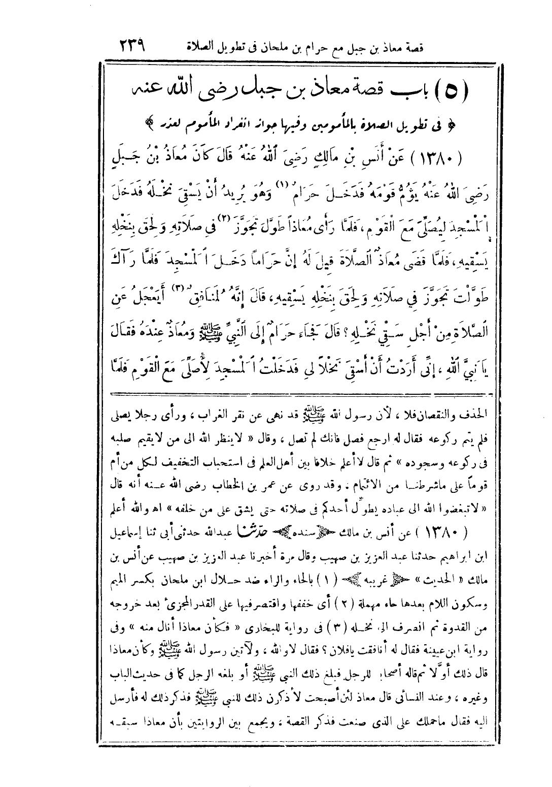 (1380) عن أنس بن مالك مالكٍ رضى الله عنه كان معاذ بن جبلٍ رضى الله عنه يومُّ قومه فدخل حرامٌ وهو يريد أن يشقى نخله فدخل المسجد ليصلِّى مع القوم، فلمَّا رأى معاذًا طوَّل تجوَّز فى صلاته ولحق بنخله يسقيه، فلمَّا قضى معاذٌ الصَّلاة قيل له إنَّ حرامًا دخل المسجد فلمَّا رآك طوَّلت تجوَّز في صلاته ولحق بنخله يسقيه، قال إنَّه لمنافقٌ أيعجل عن الصَّلاة من أجل سقي نخله؟ قال فجاء حرامٌ إلى النبيِّ صلى الله عليه وسلم ومعاذٌ عنده فقال يا نبي الله، إنِّى أردت أن أسقى نخلًا لى فدخلت المسجد لأصلِّى مع القوم فلمَّا